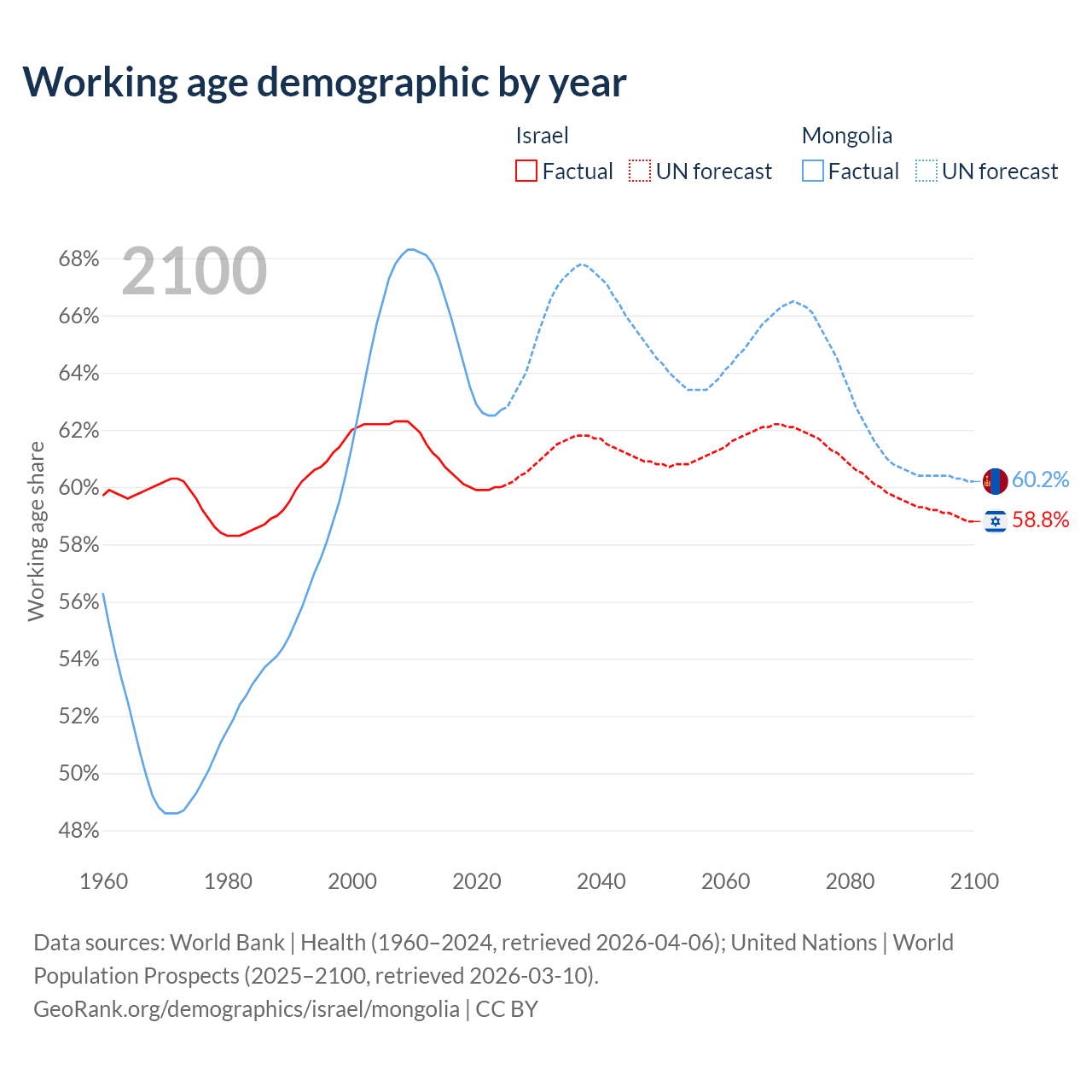 - Israel has 6.18M working age adults (aged 15-64) vs 2.27M in Mongolia.