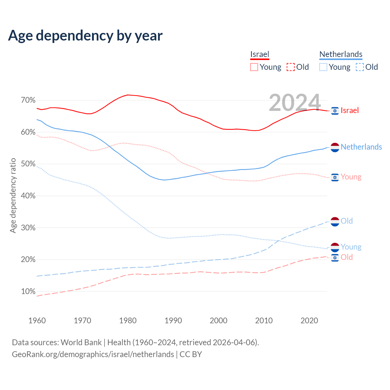 - Israel is ranked 103/196 by median age (oldest to youngest) vs 33/196 for the Netherlands.