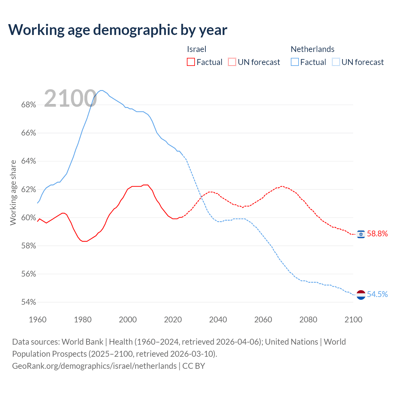 Median age Israel vs Netherlands, 1960-2100