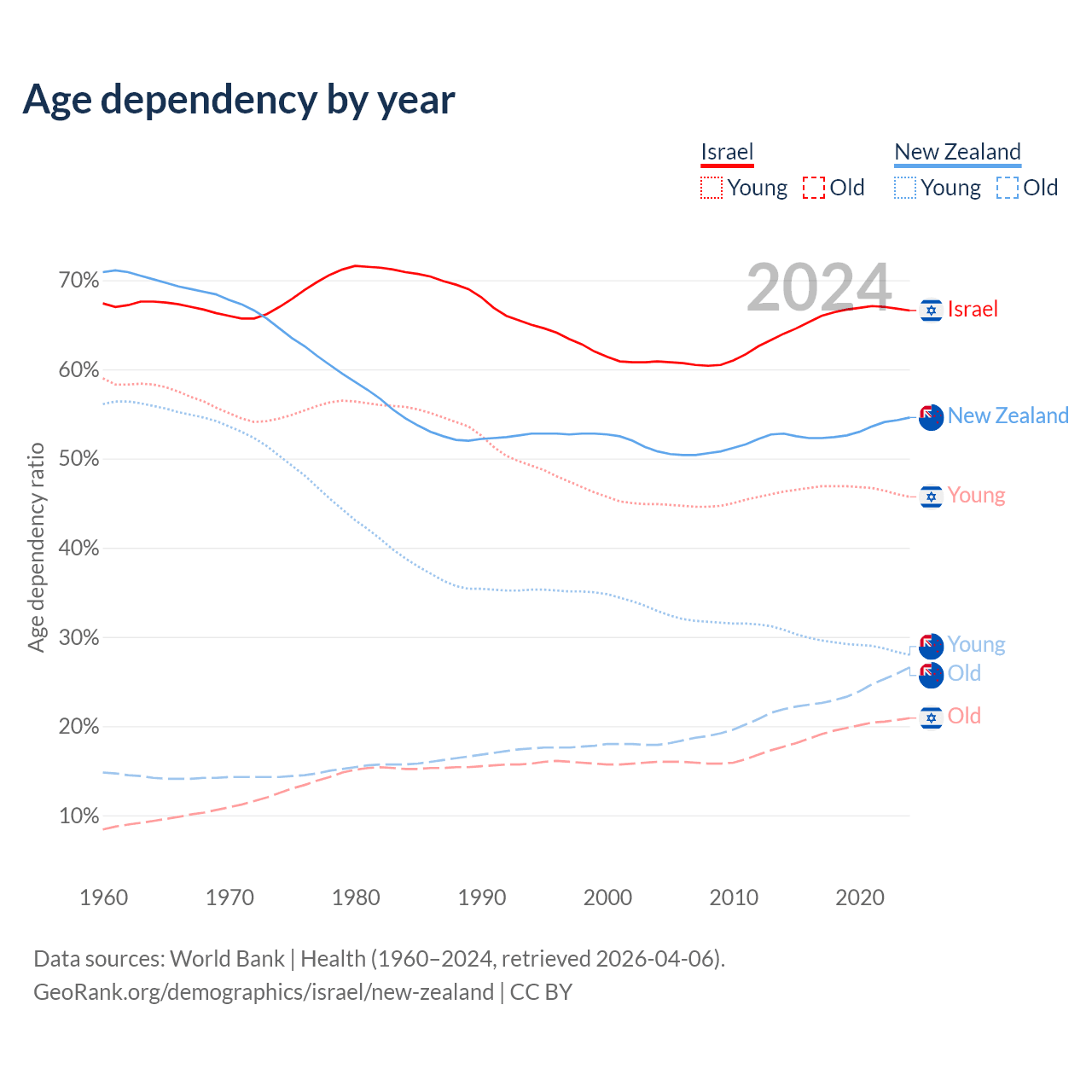 - Israel is ranked 103/196 by median age (oldest to youngest) vs 56/196 for New Zealand.