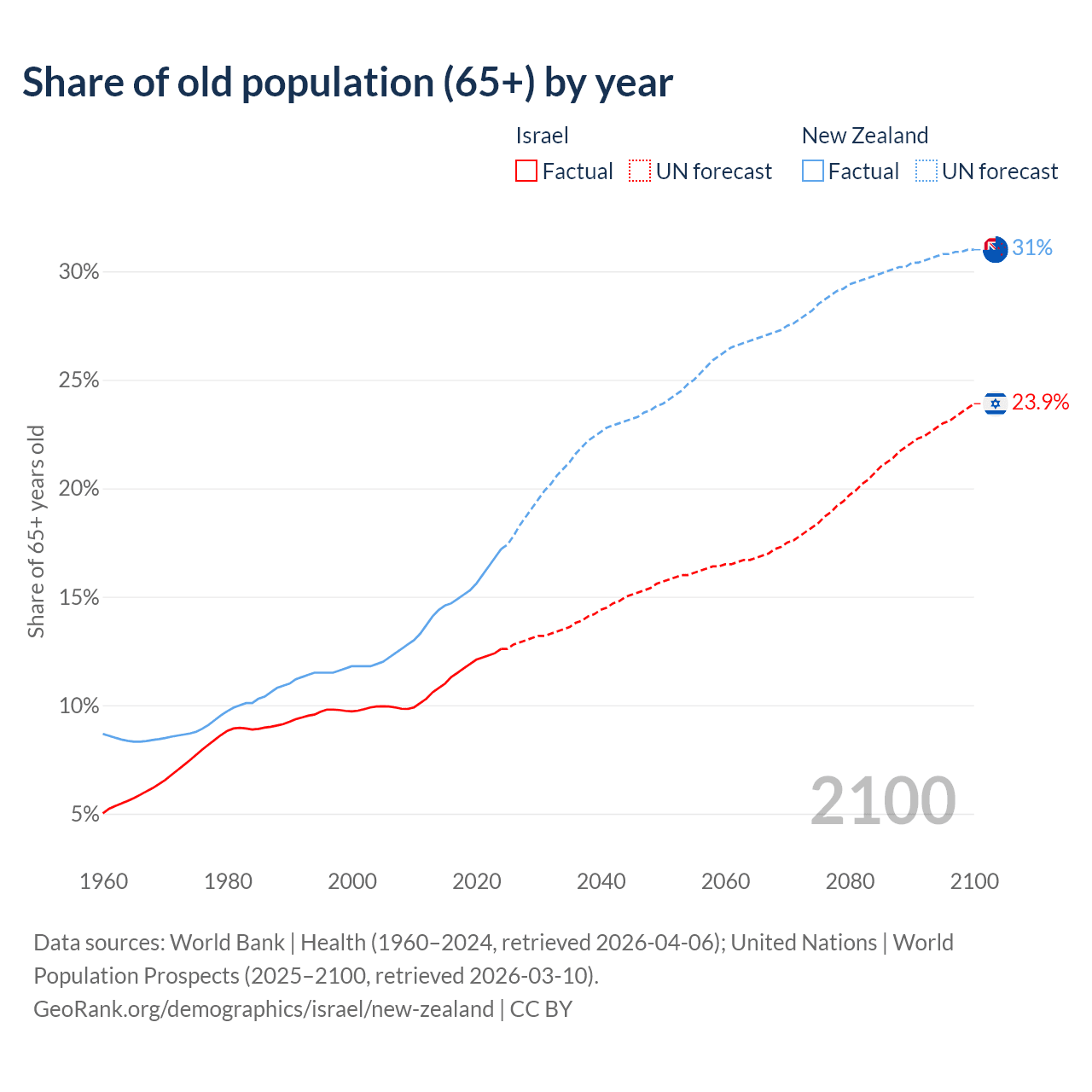 The share of older people aged 65 and over is 12.6% in Israel and 17.2% in New Zealand. Life expectancy in Israel compared to New Zealand .