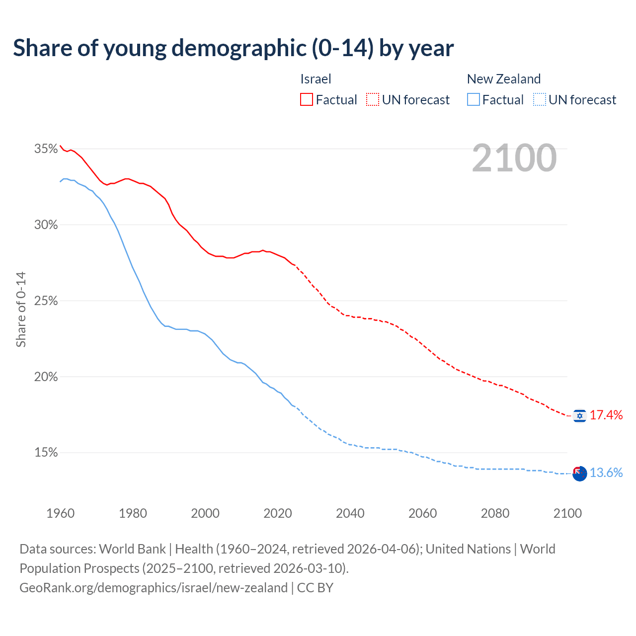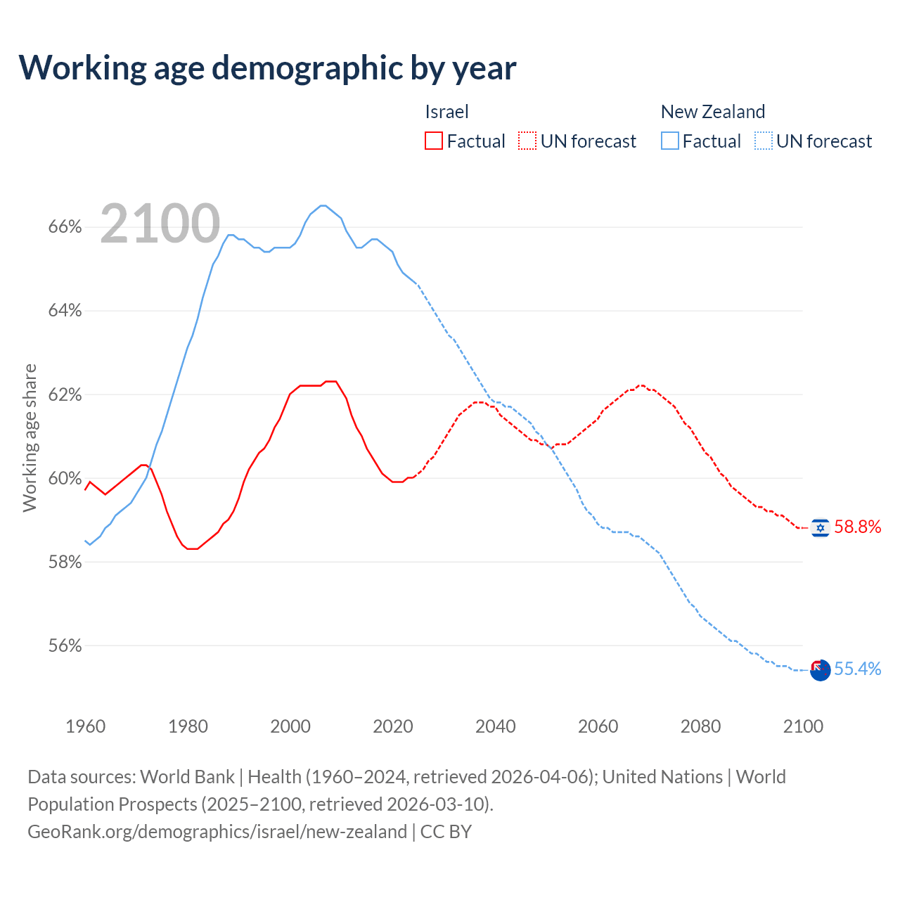 Median age Israel vs New Zealand, 1960-2100