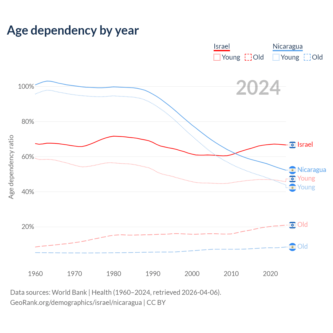 - Israel is ranked 103/196 by median age (oldest to youngest) vs 125/196 for Nicaragua.