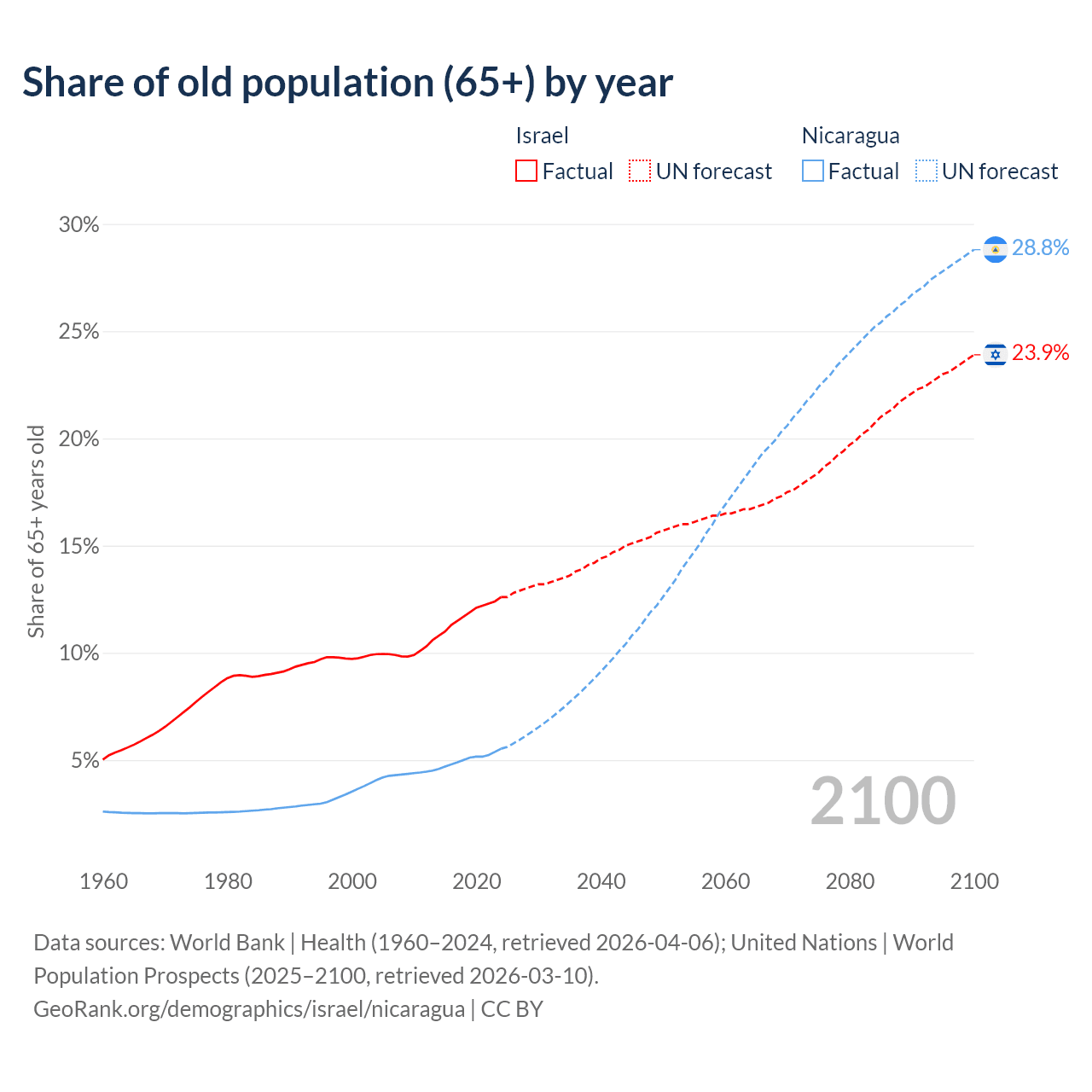 The share of older people aged 65 and over is 12.6% in Israel and 5.53% in Nicaragua. Life expectancy in Israel compared to Nicaragua .