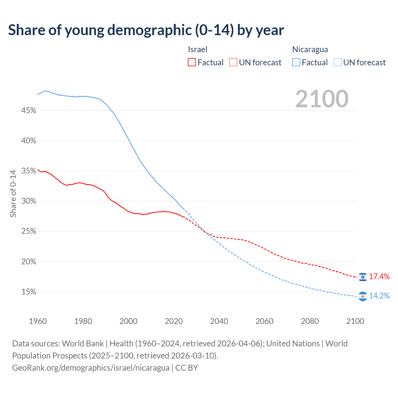 - The share of young demographic (0-15 years old) in Israel is 27.4% vs 28.8% in Nicaragua.