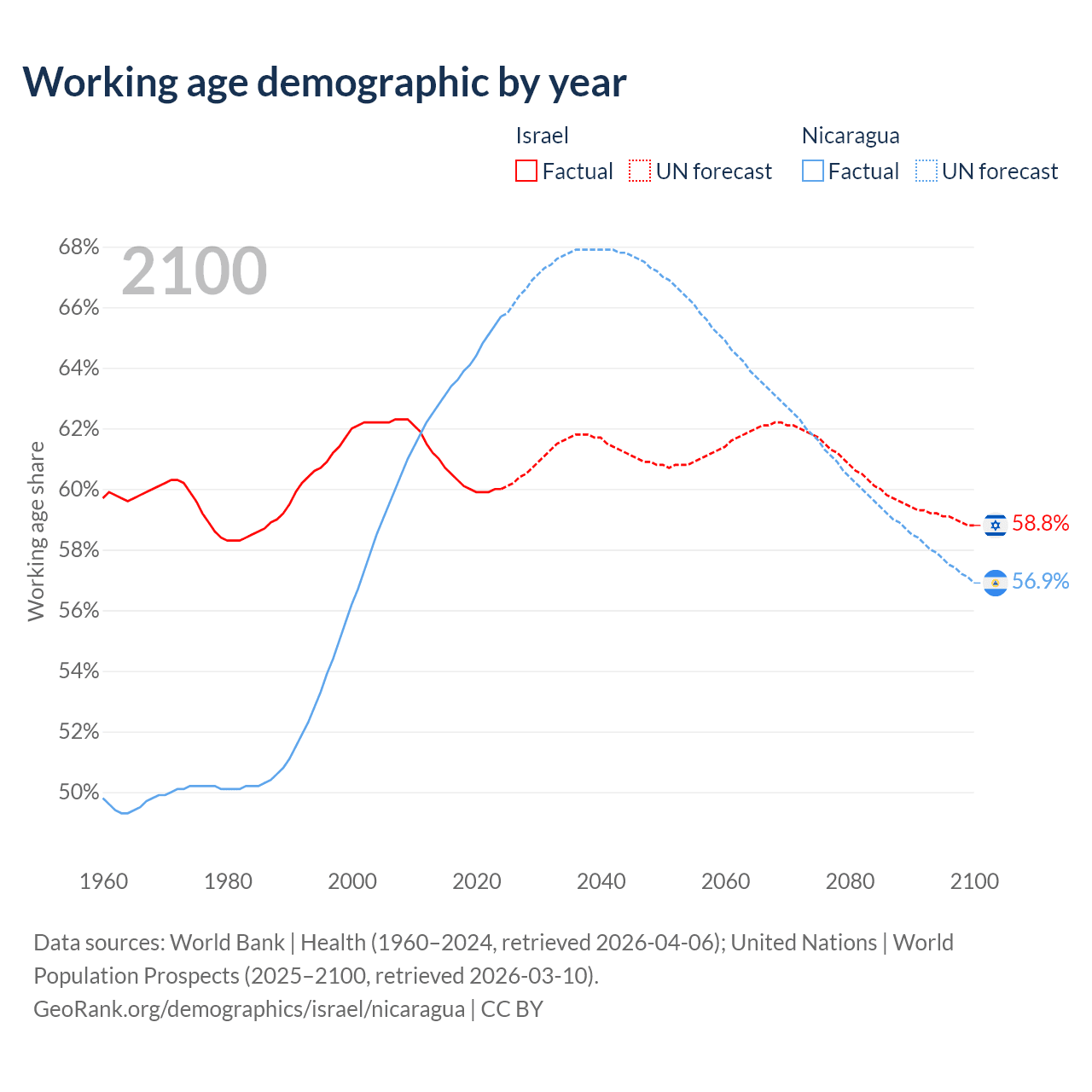 Median age Israel vs Nicaragua, 1960-2100