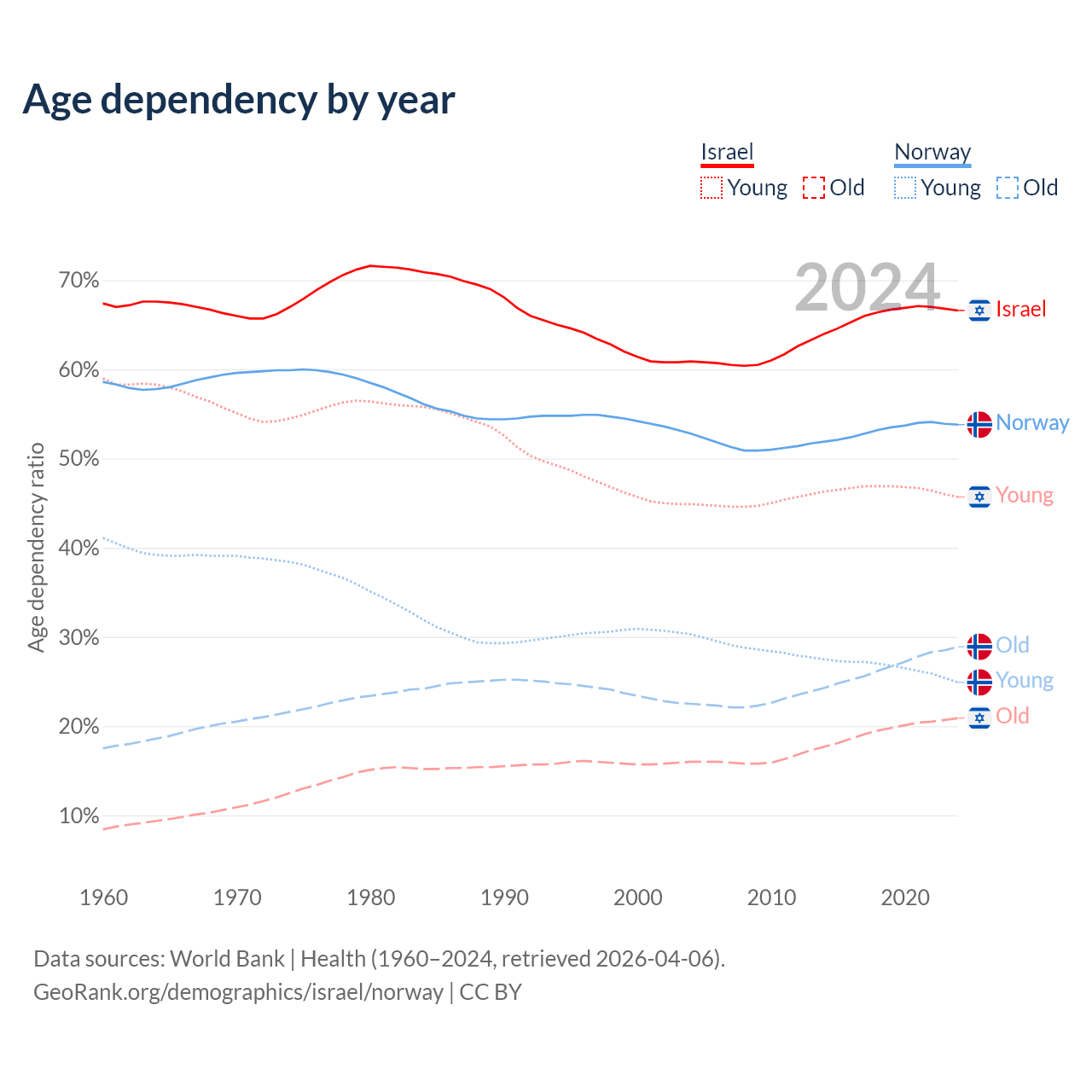 - Israel is ranked 103/196 by median age (oldest to youngest) vs 43/196 for Norway.