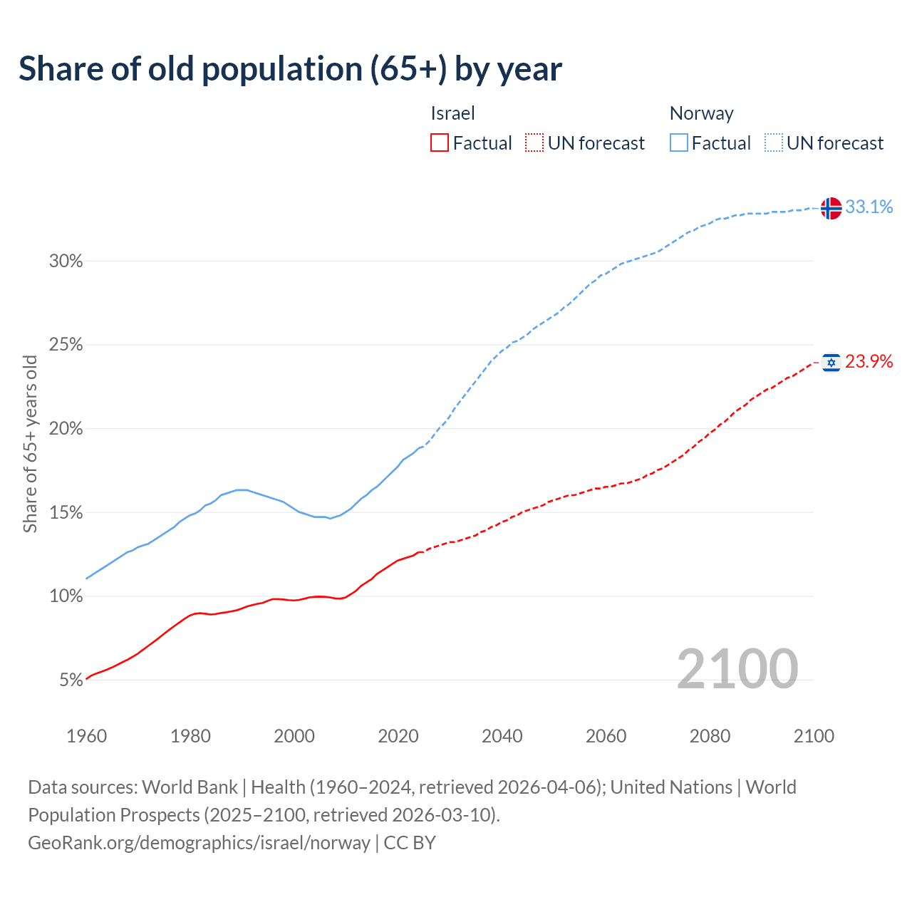 The share of older people aged 65 and over is 12.6% in Israel and 18.8% in Norway. Life expectancy in Israel compared to Norway .