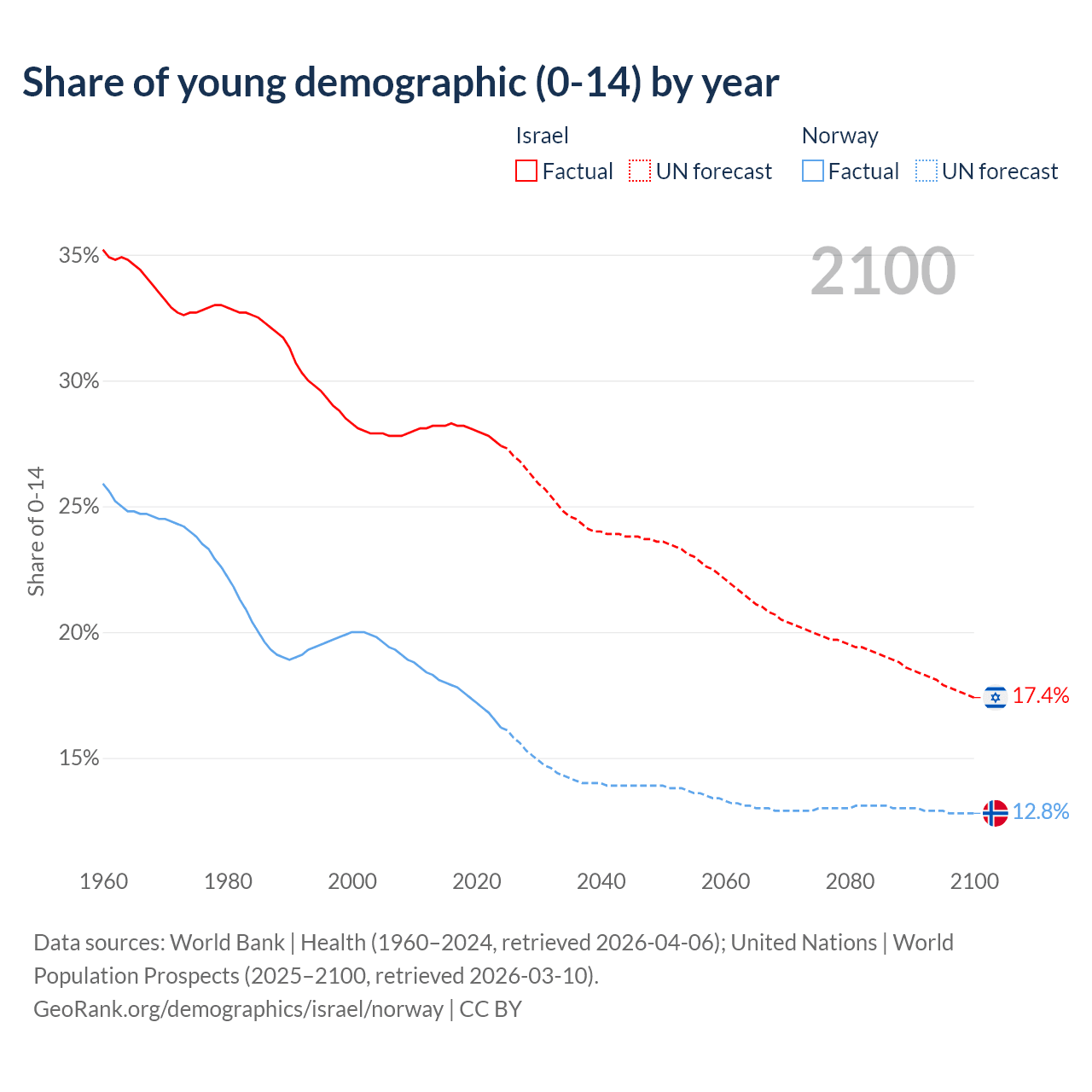 - The share of young demographic (0-15 years old) in Israel is 27.4% vs 16.2% in Norway.