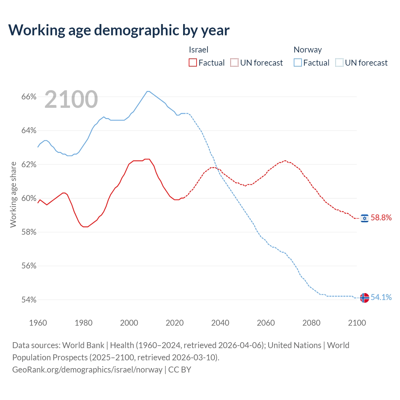 - Israel has 6.18M working age adults (aged 15-64) vs 3.69M in Norway.