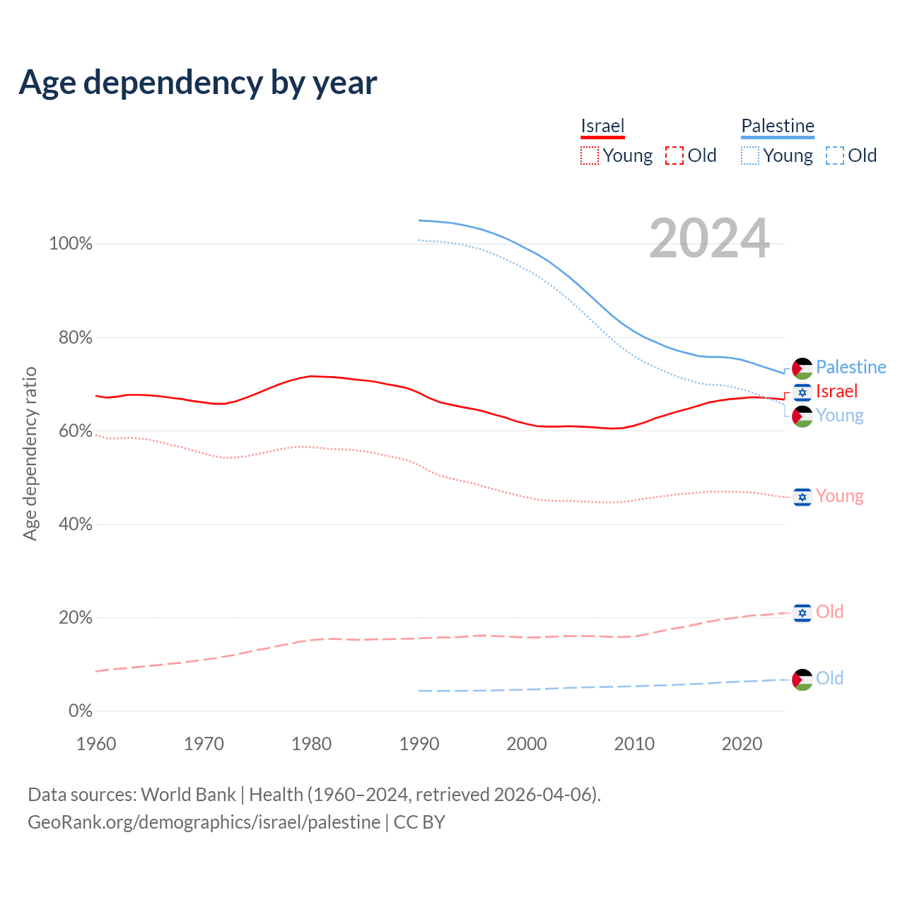 - Israel is ranked 103/196 by median age (oldest to youngest) vs 157/196 for Palestine.