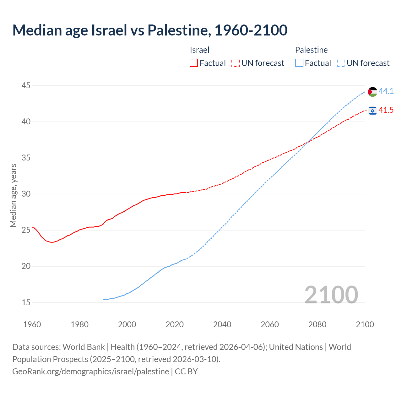Median age Israel vs Palestine, 1960-2100