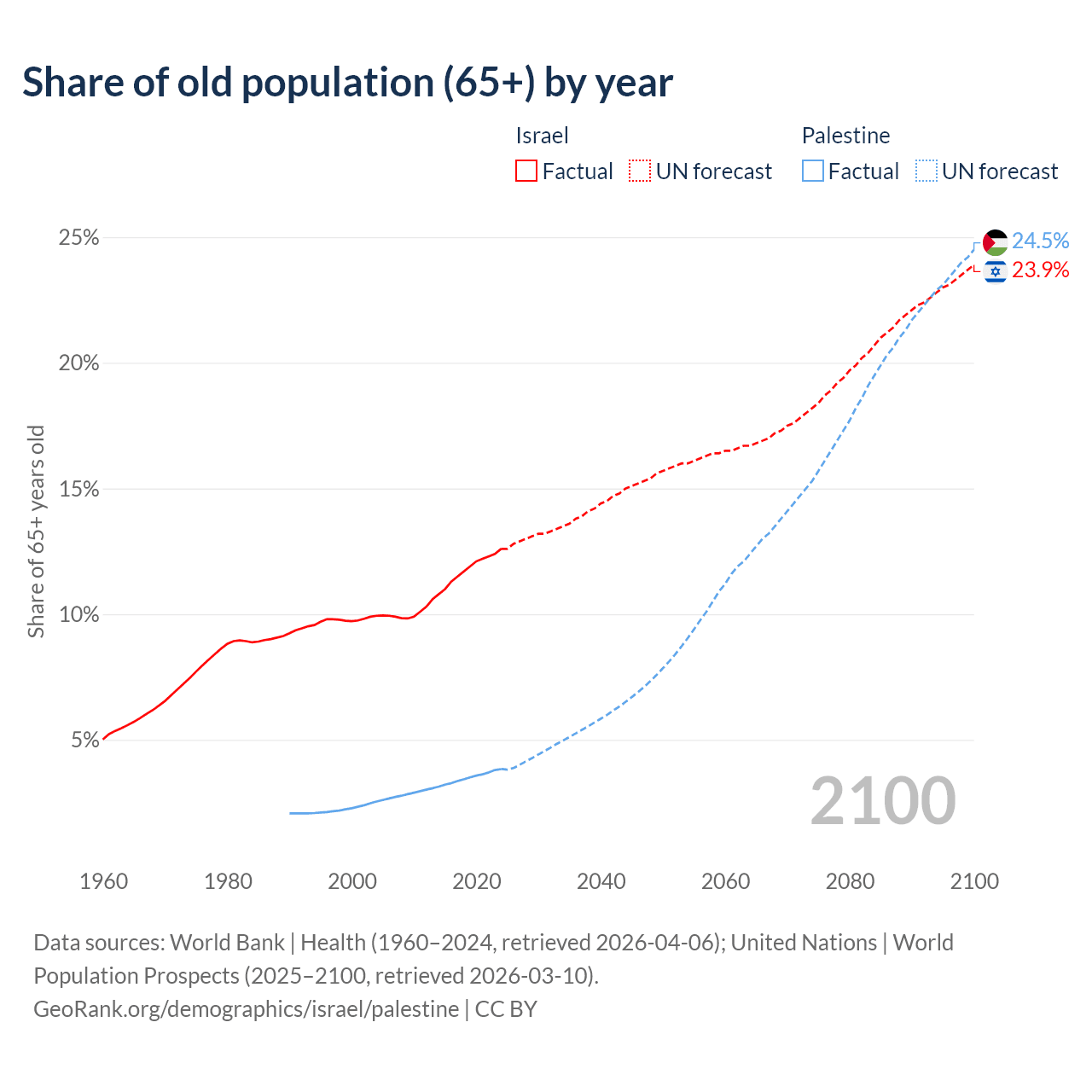 - The share of old-age demographic (65+) in Israel is 12.6% vs 3.84% in Palestine.