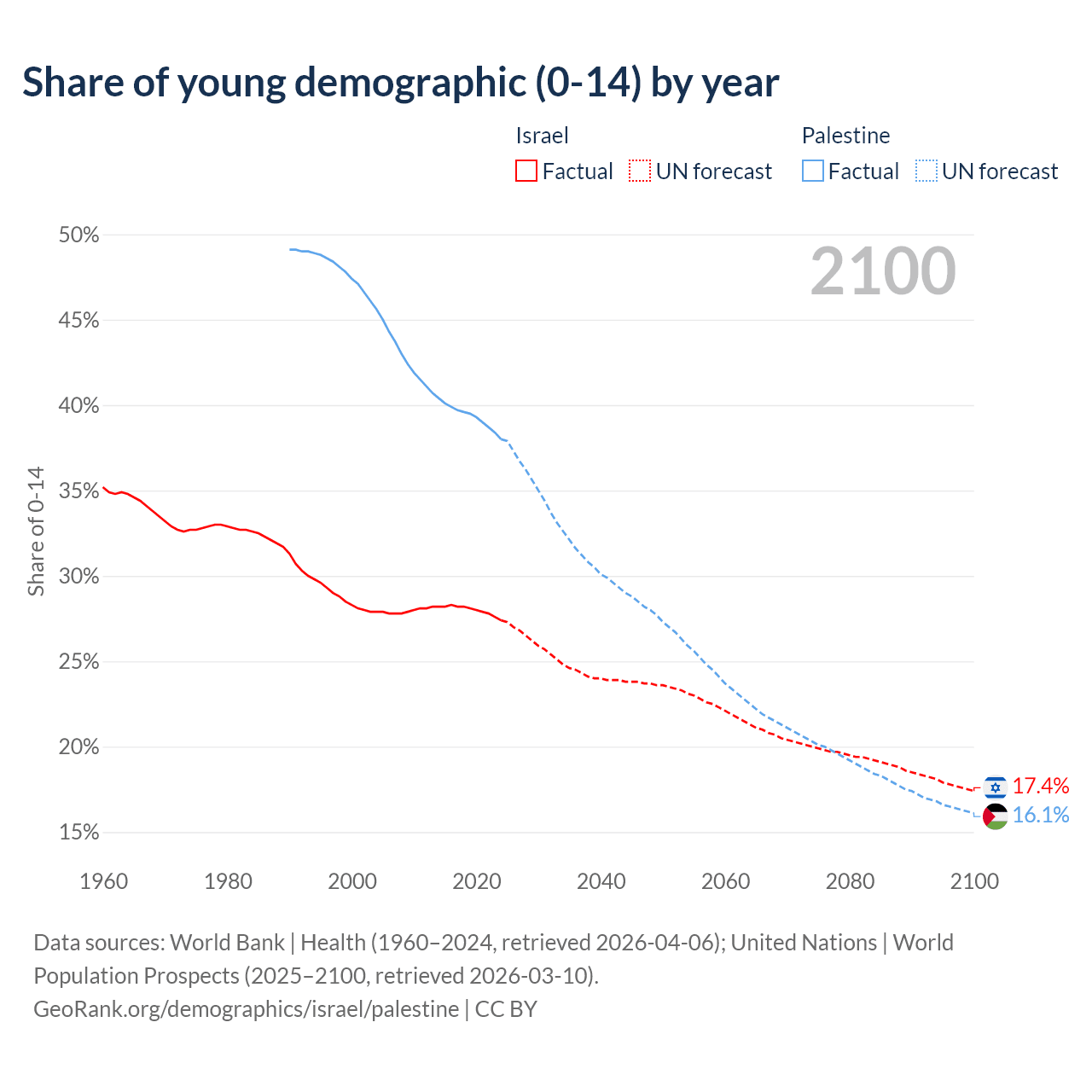 - The share of young demographic (0-15 years old) in Israel is 27.4% vs 38% in Palestine.