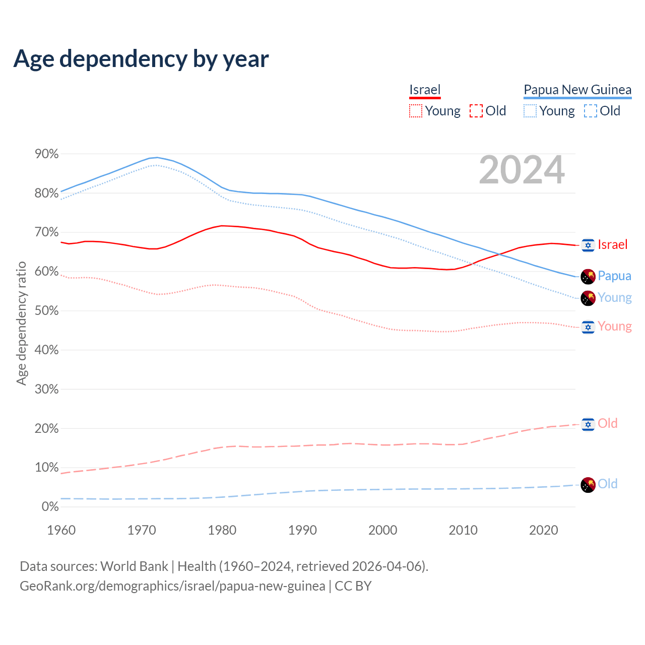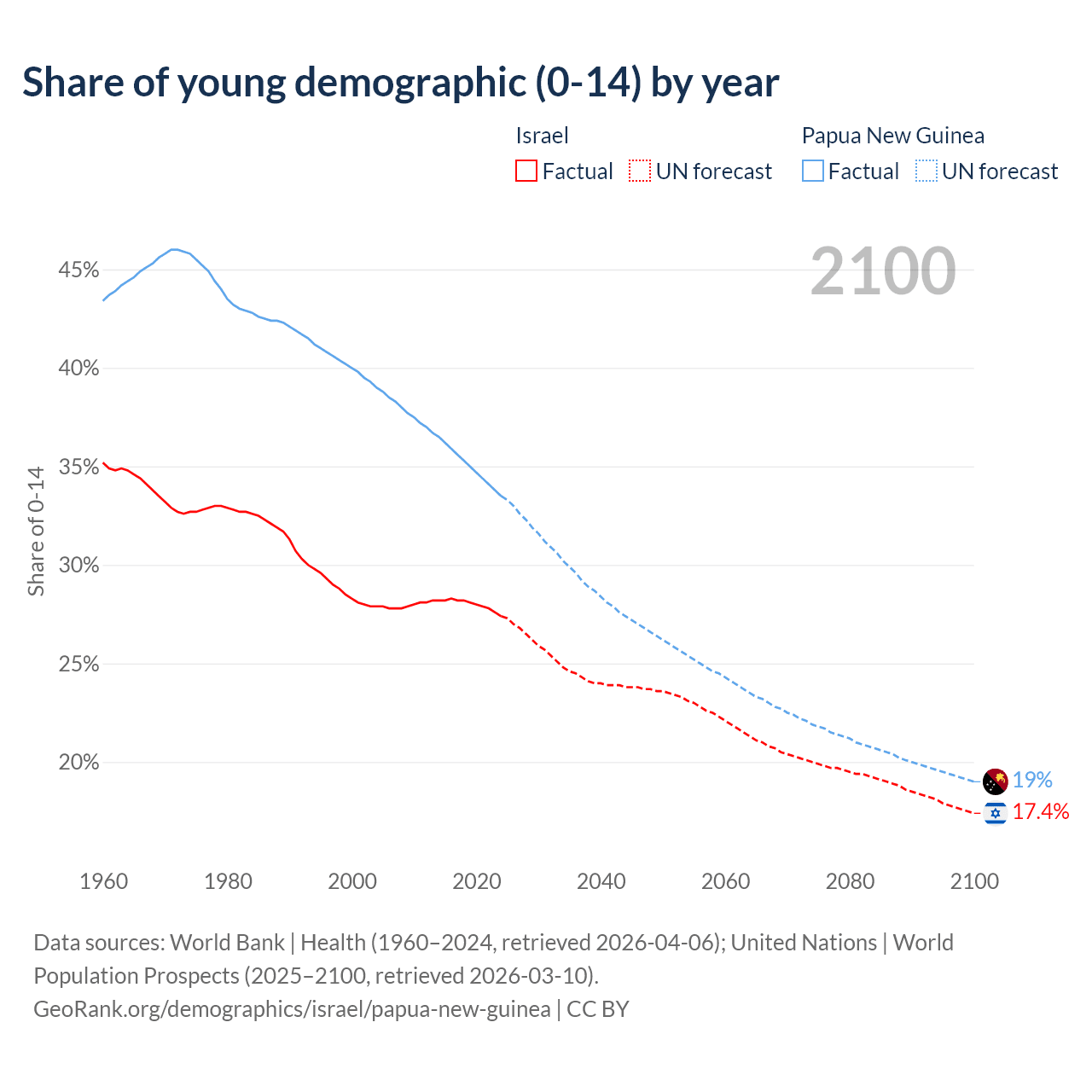 - The share of young demographic (0-15 years old) in Israel is 27.4% vs 33.5% in Papua New Guinea.