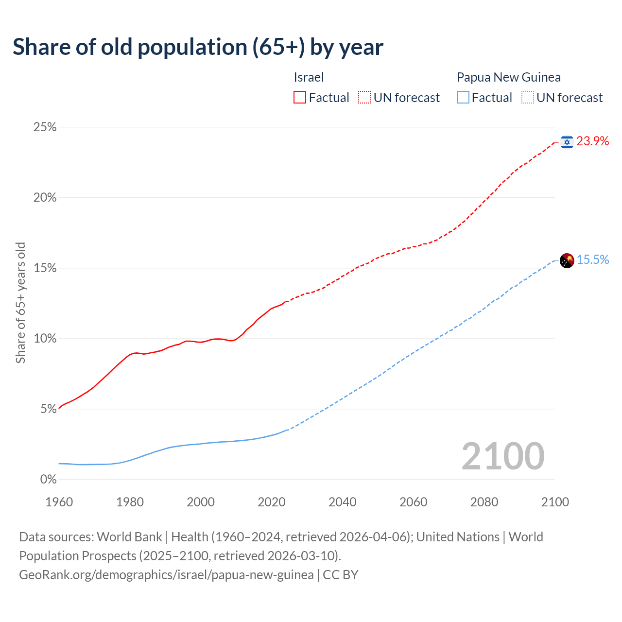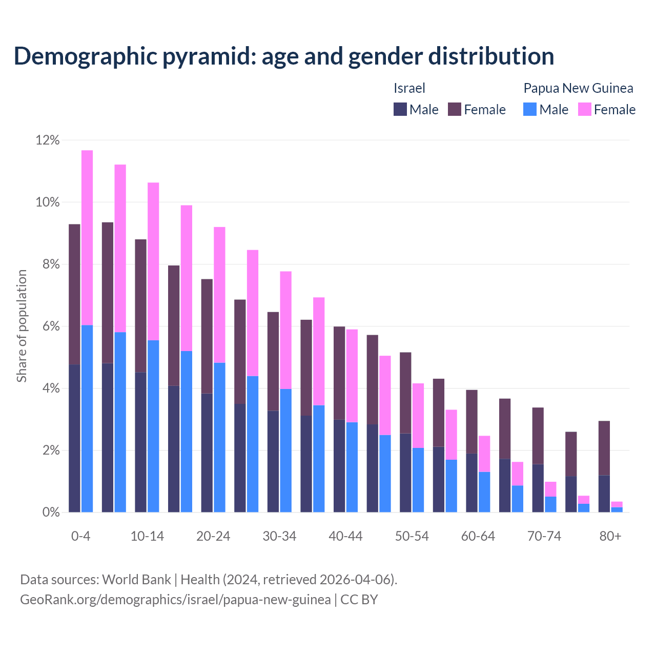 The share of older people aged 65 and over is 12.6% in Israel and 3.46% in Papua New Guinea. Life expectancy in Israel compared to Papua New Guinea .