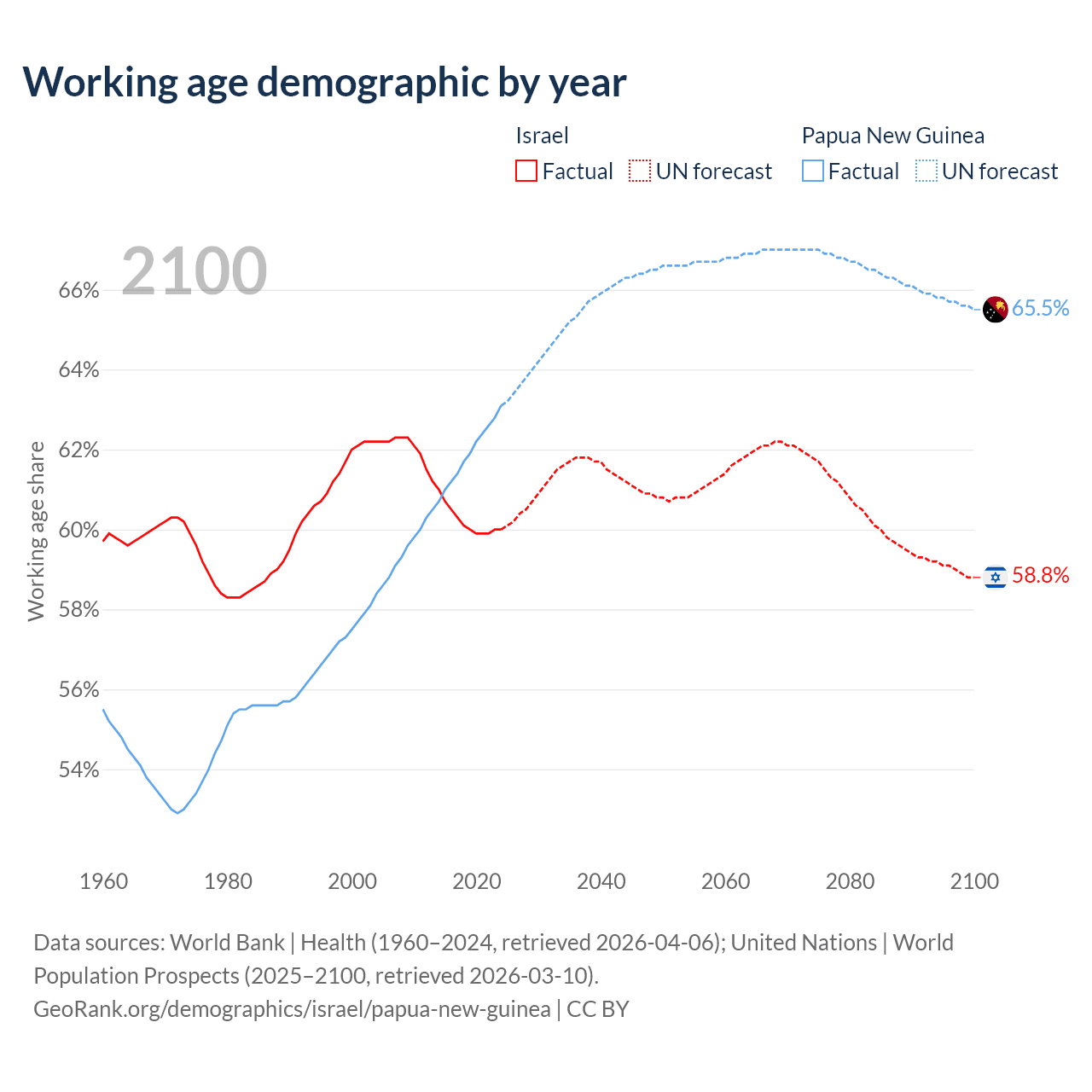 Median age Israel vs Papua New Guinea, 1960-2100