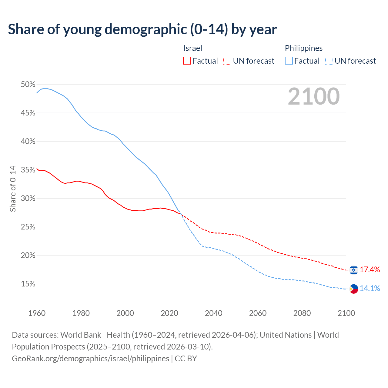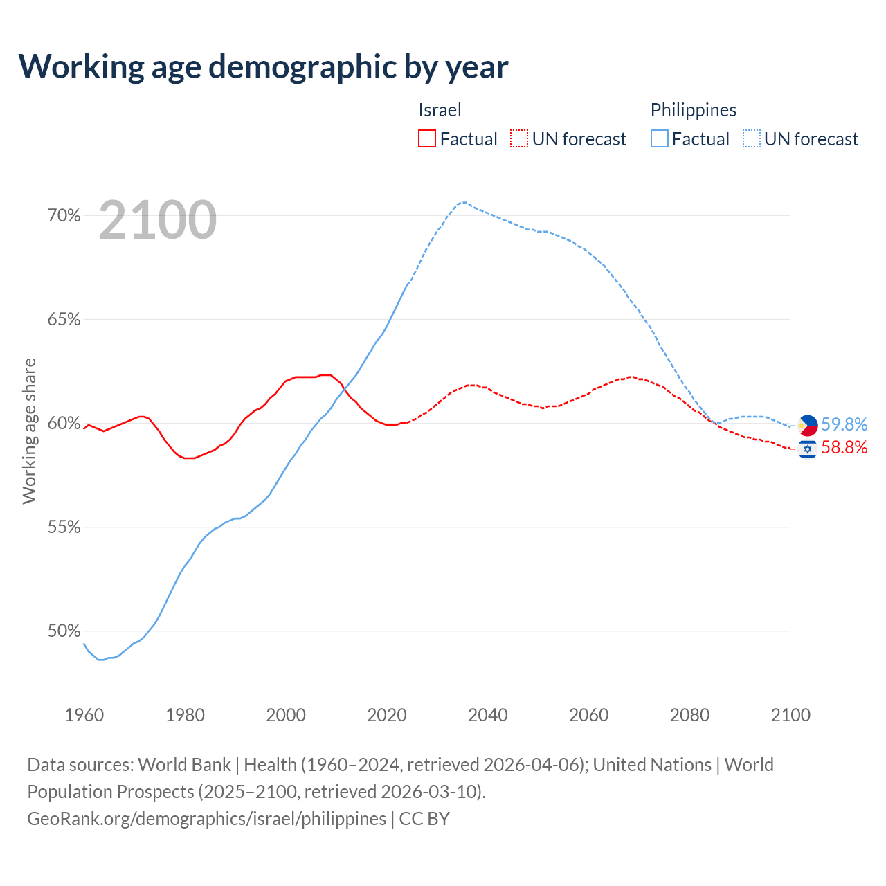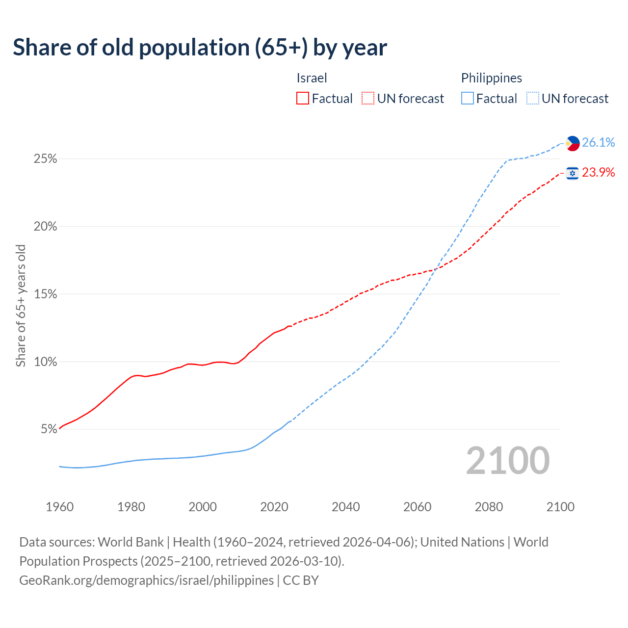 Median age Israel vs Philippines, 1960-2100