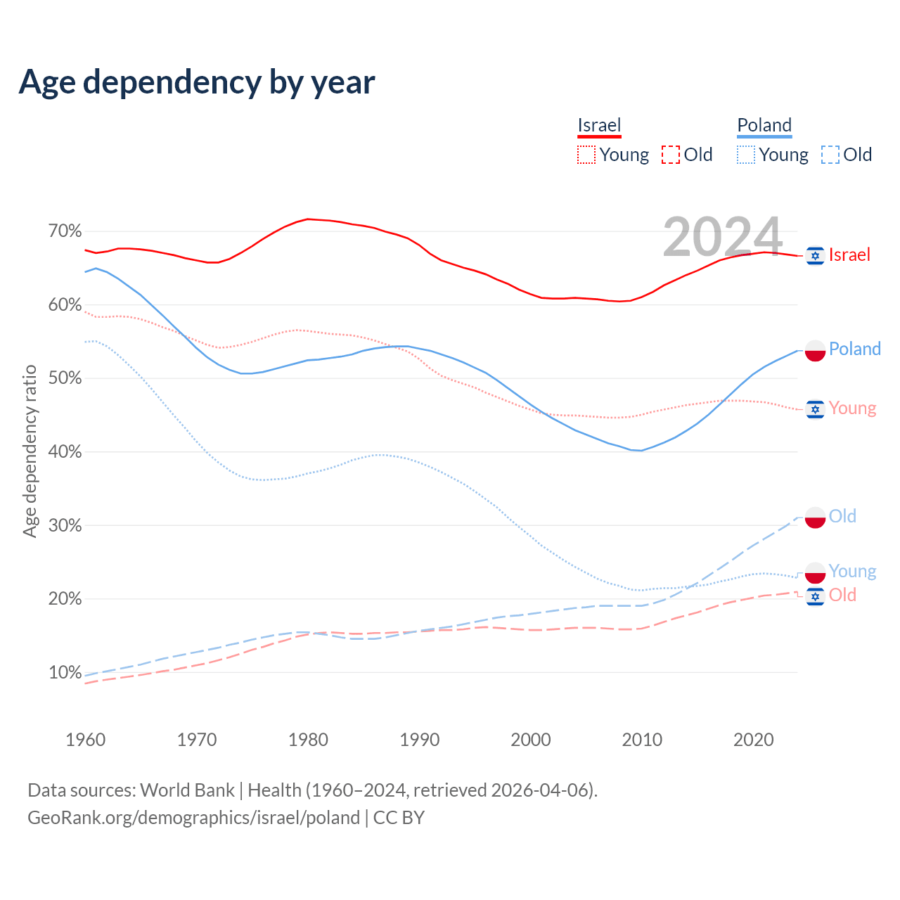 - Israel is ranked 103/196 by median age (oldest to youngest) vs 30/196 for Poland.