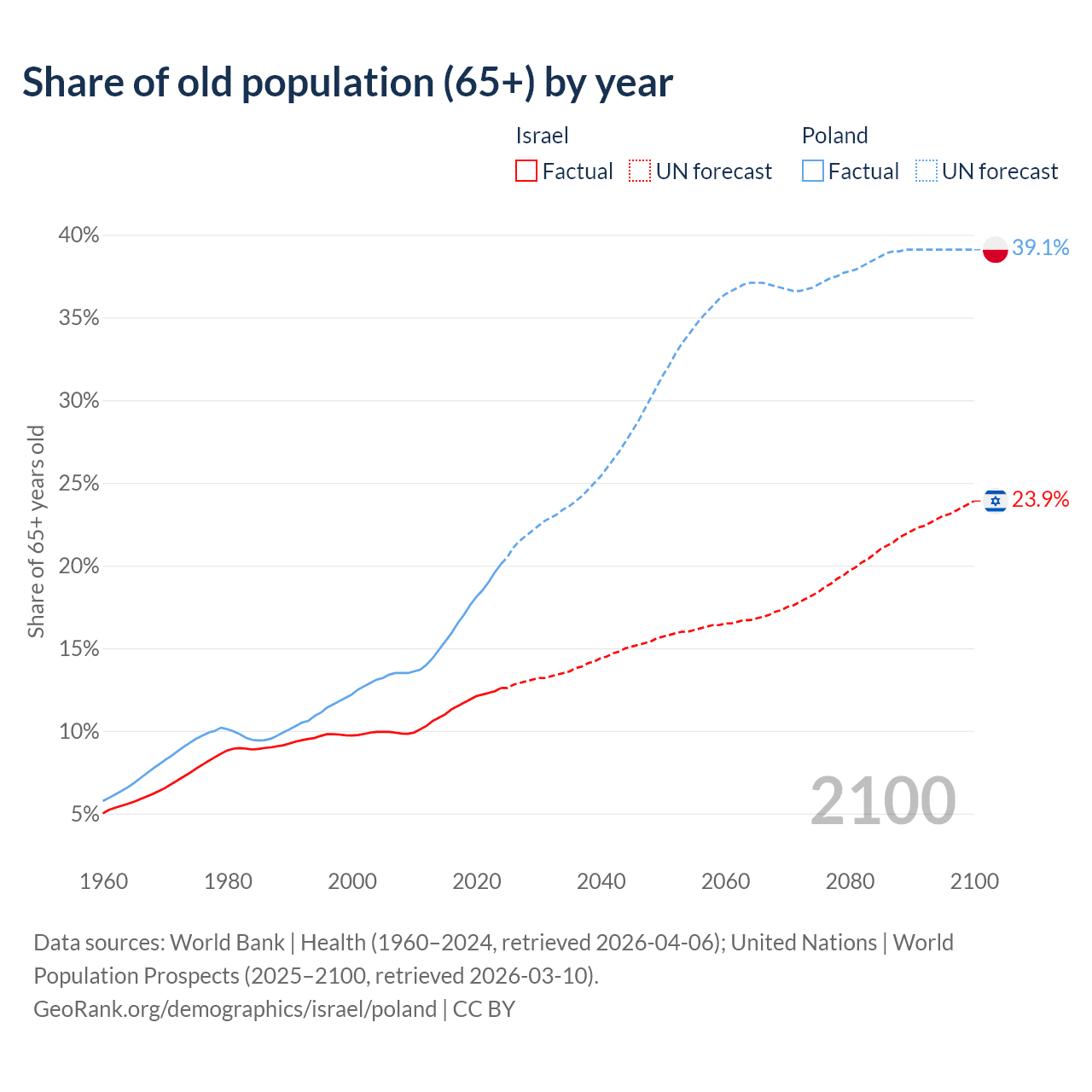 The share of older people aged 65 and over is 12.6% in Israel and 20.1% in Poland. Life expectancy in Israel compared to Poland .