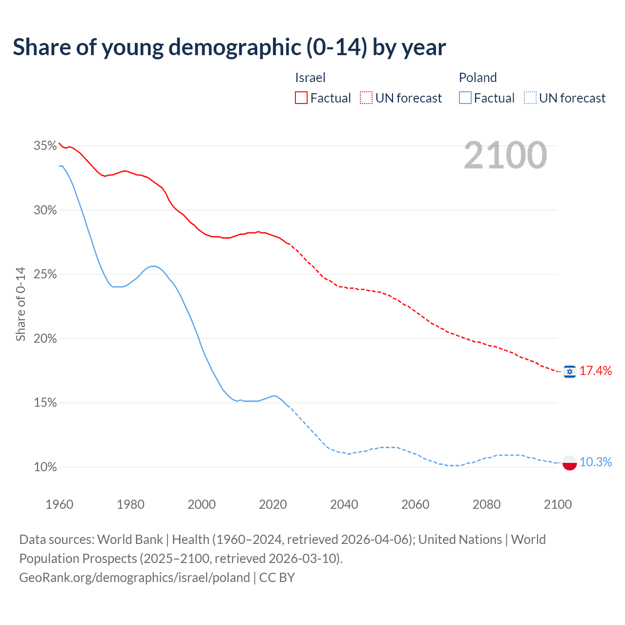 - The share of young demographic (0-15 years old) in Israel is 27.4% vs 14.8% in Poland.