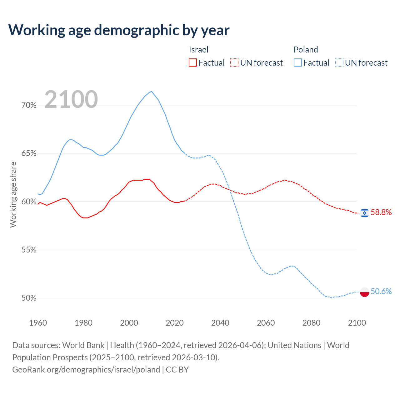 Median age Israel vs Poland, 1960-2100