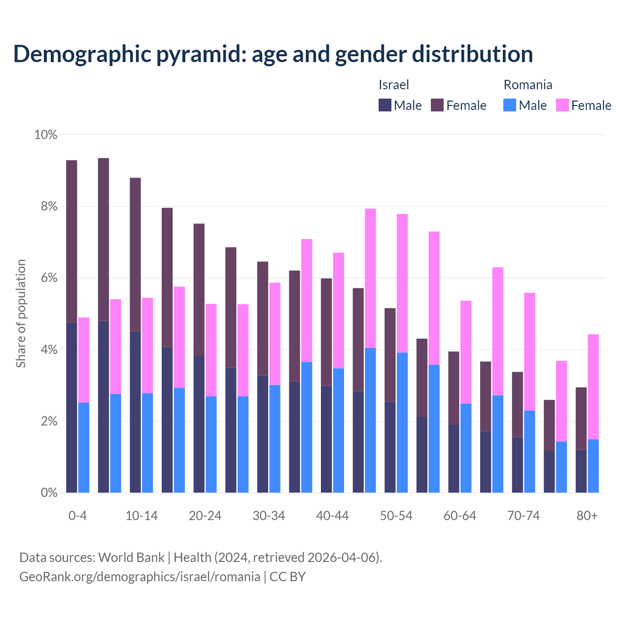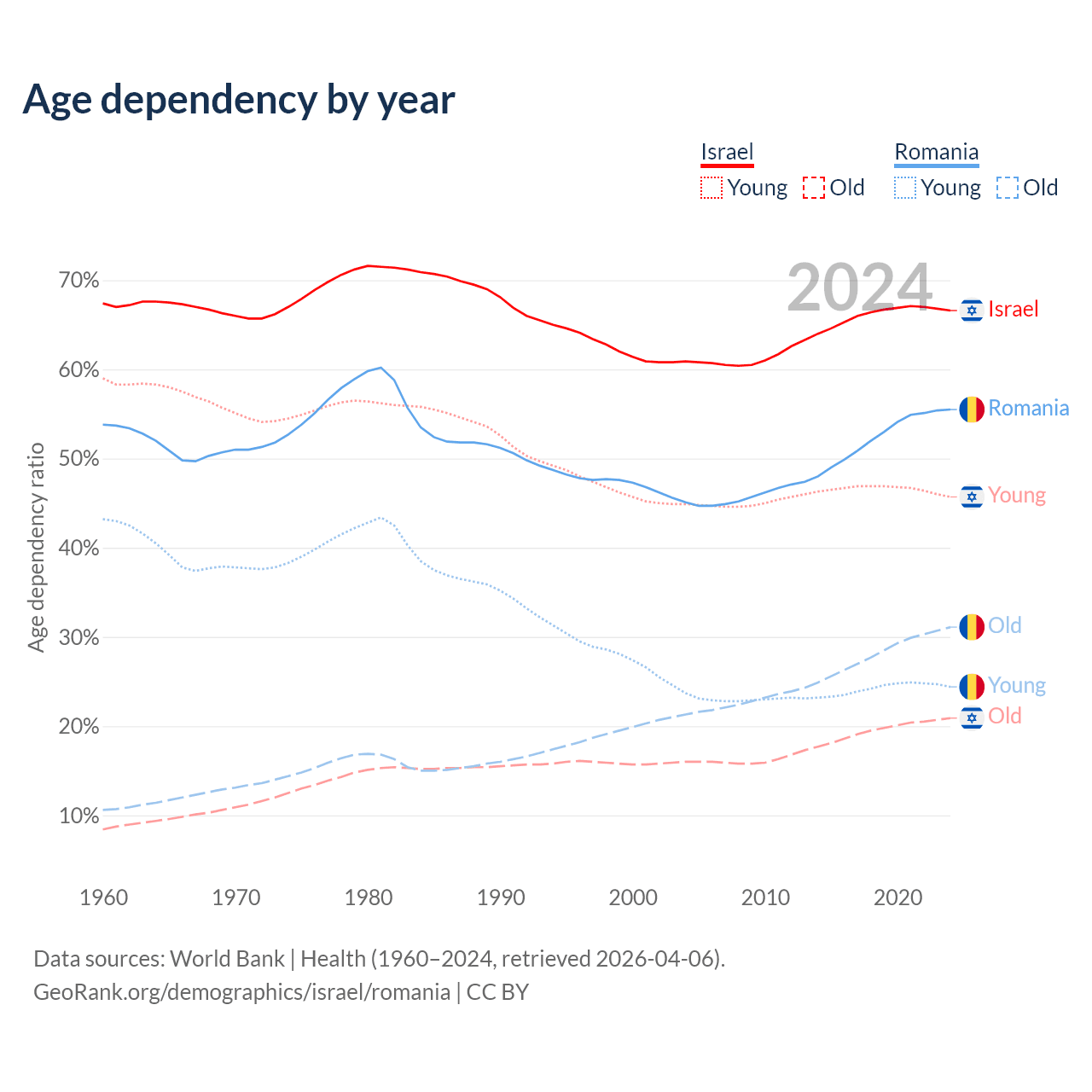 - Israel is ranked 103/196 by median age (oldest to youngest) vs 23/196 for Romania.