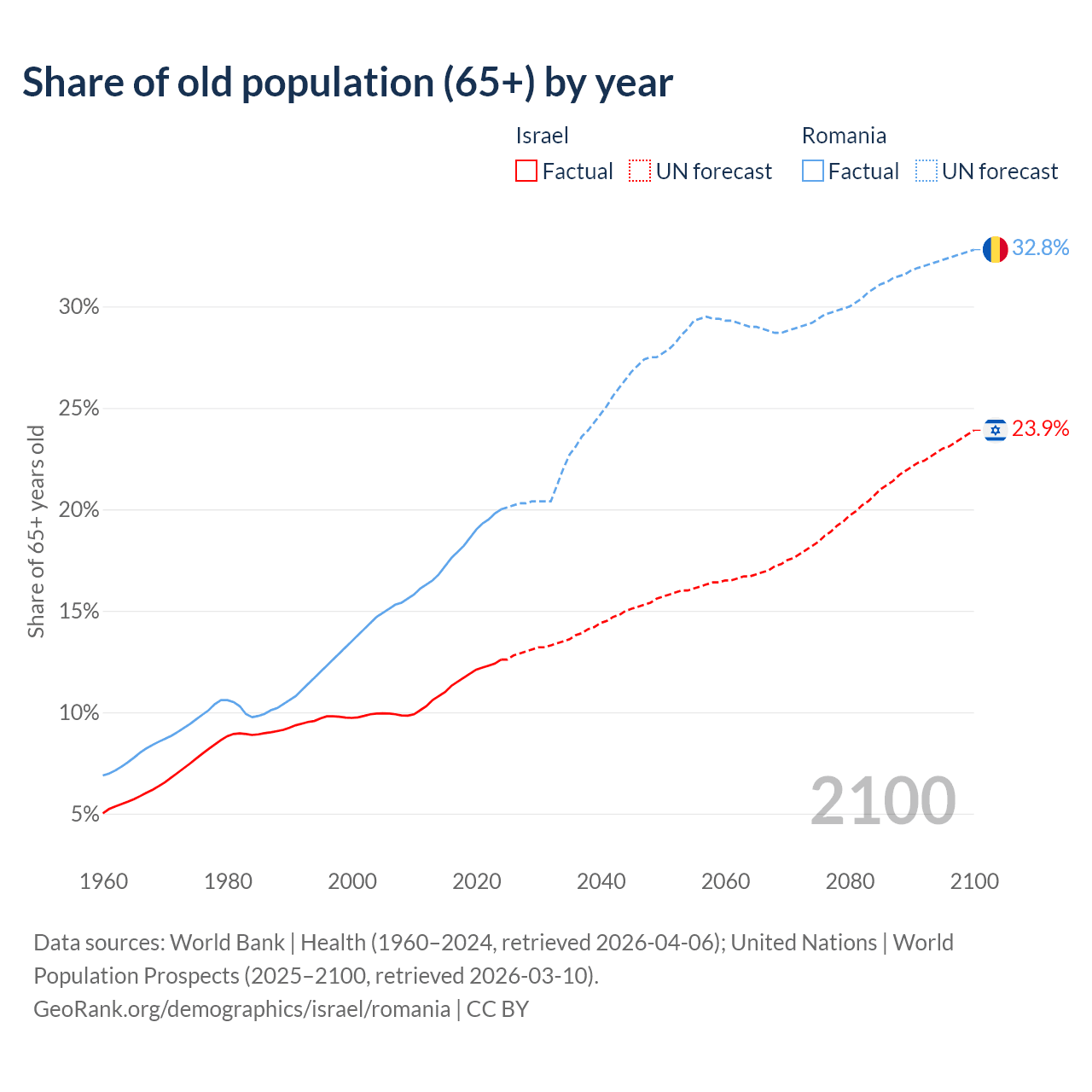The share of older people aged 65 and over is 12.6% in Israel and 20% in Romania. Life expectancy in Israel compared to Romania .