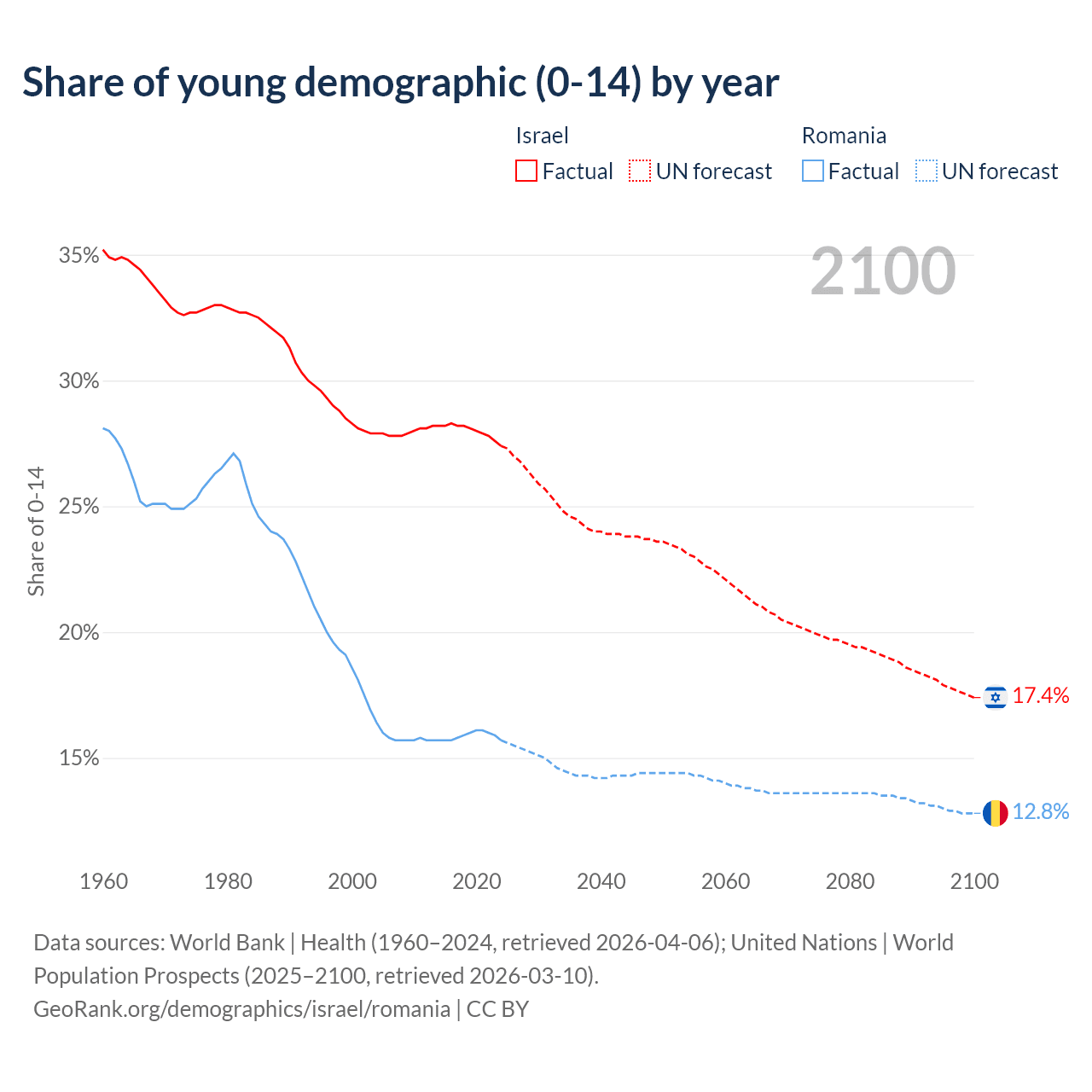 - The share of young demographic (0-15 years old) in Israel is 27.4% vs 15.7% in Romania.