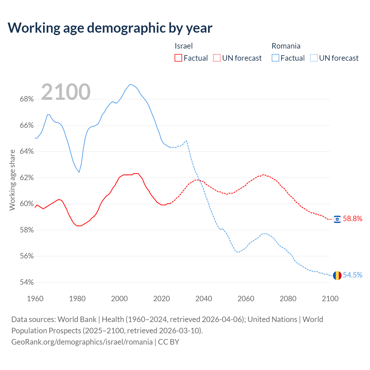 - Israel has 6.18M working age adults (aged 15-64) vs 12.1M in Romania.