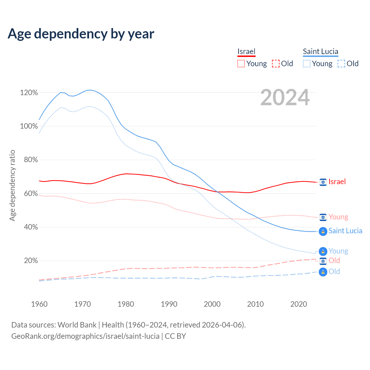 - Israel is ranked 103/196 by median age (oldest to youngest) vs 74/196 for Saint Lucia.