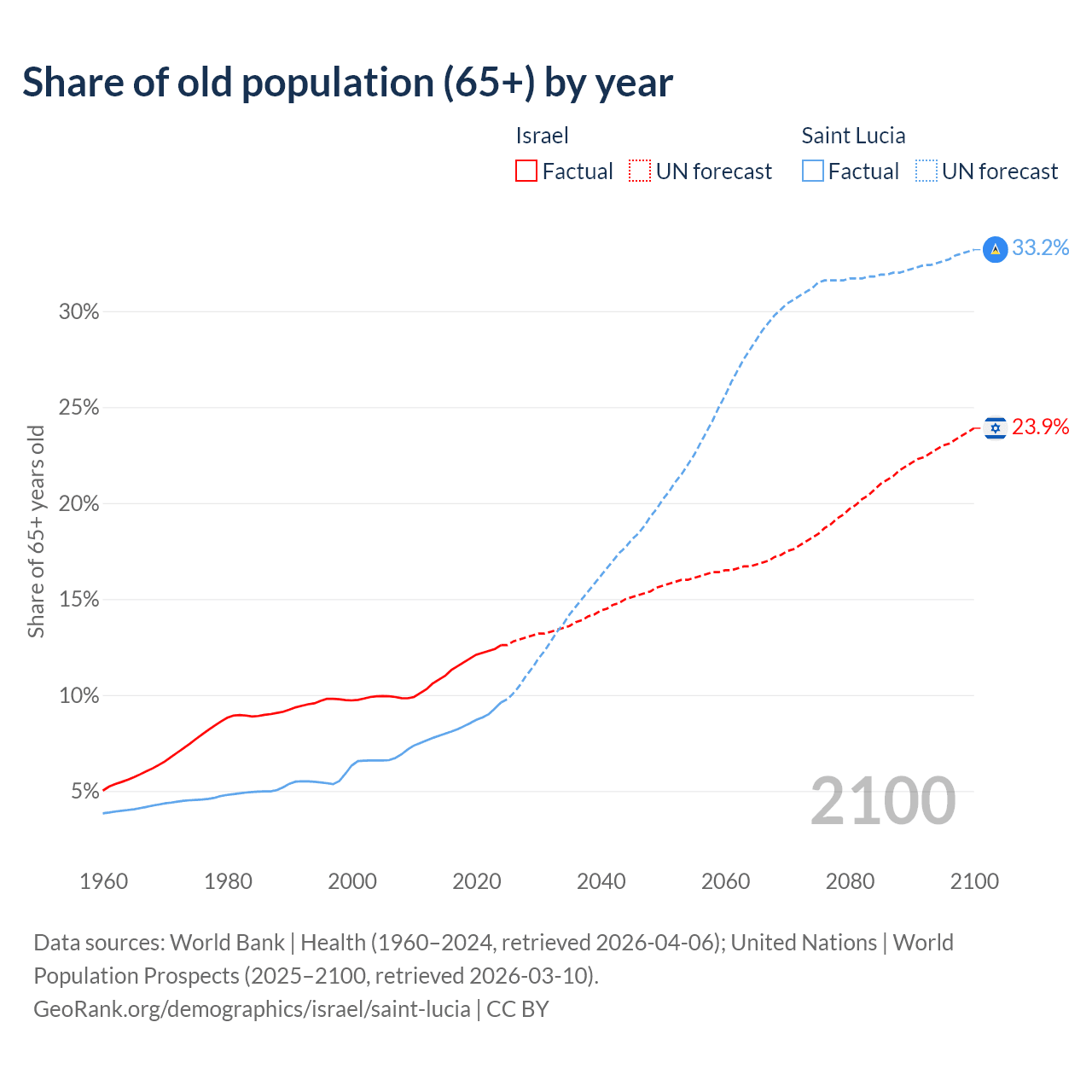 - The share of old-age demographic (65+) in Israel is 12.6% vs 9.62% in Saint Lucia.