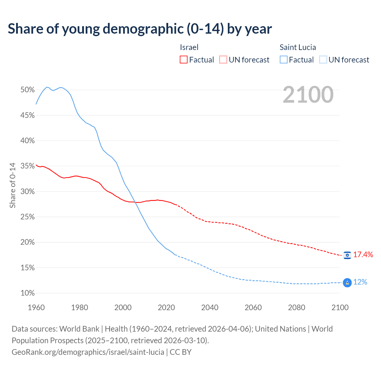 - The share of young demographic (0-15 years old) in Israel is 27.4% vs 17.5% in Saint Lucia.