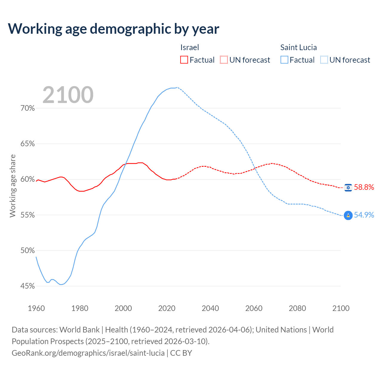 - Israel has 6.18M working age adults (aged 15-64) vs 132K in Saint Lucia.