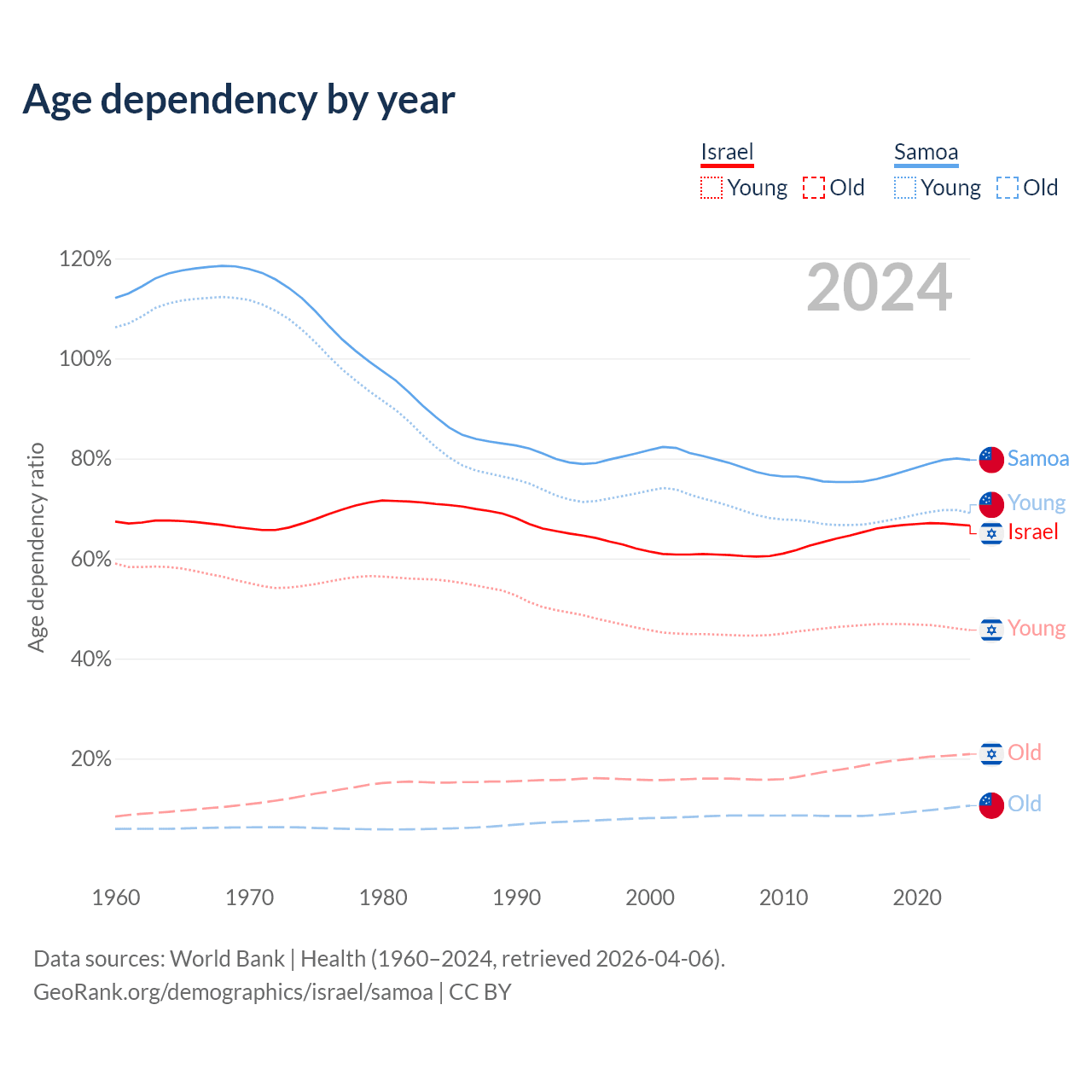 - Israel is ranked 103/196 by median age (oldest to youngest) vs 158/196 for Samoa.