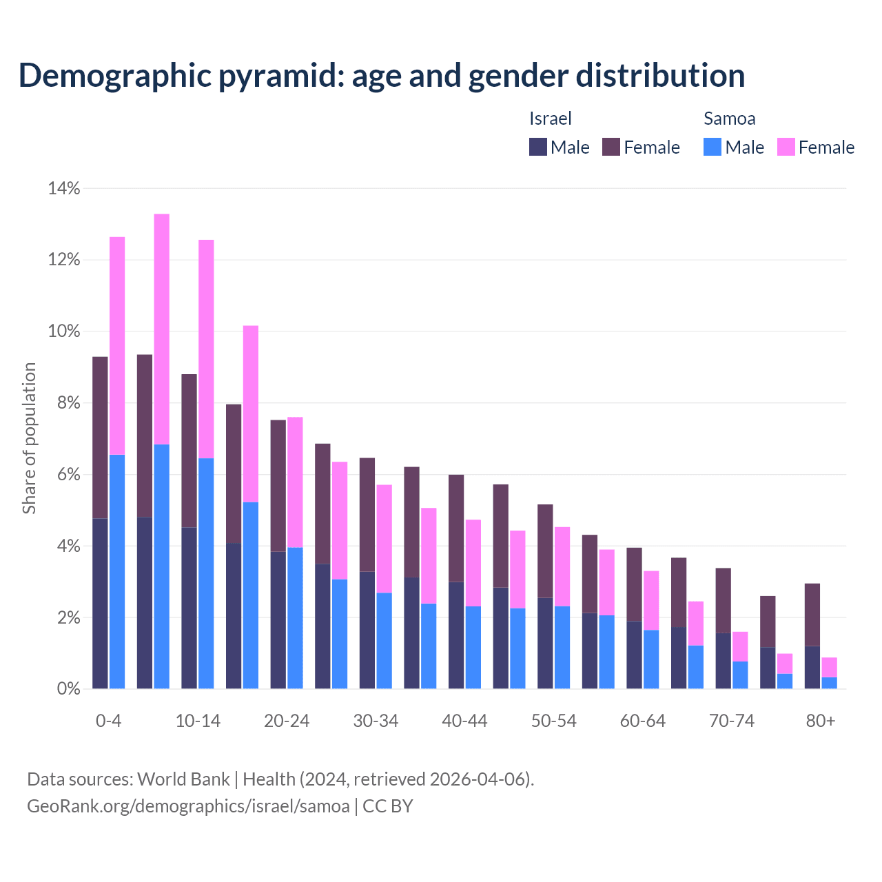 - As of 2026, the population of Israel is 10.3M vs 221K in Samoa - 46.6 times difference.