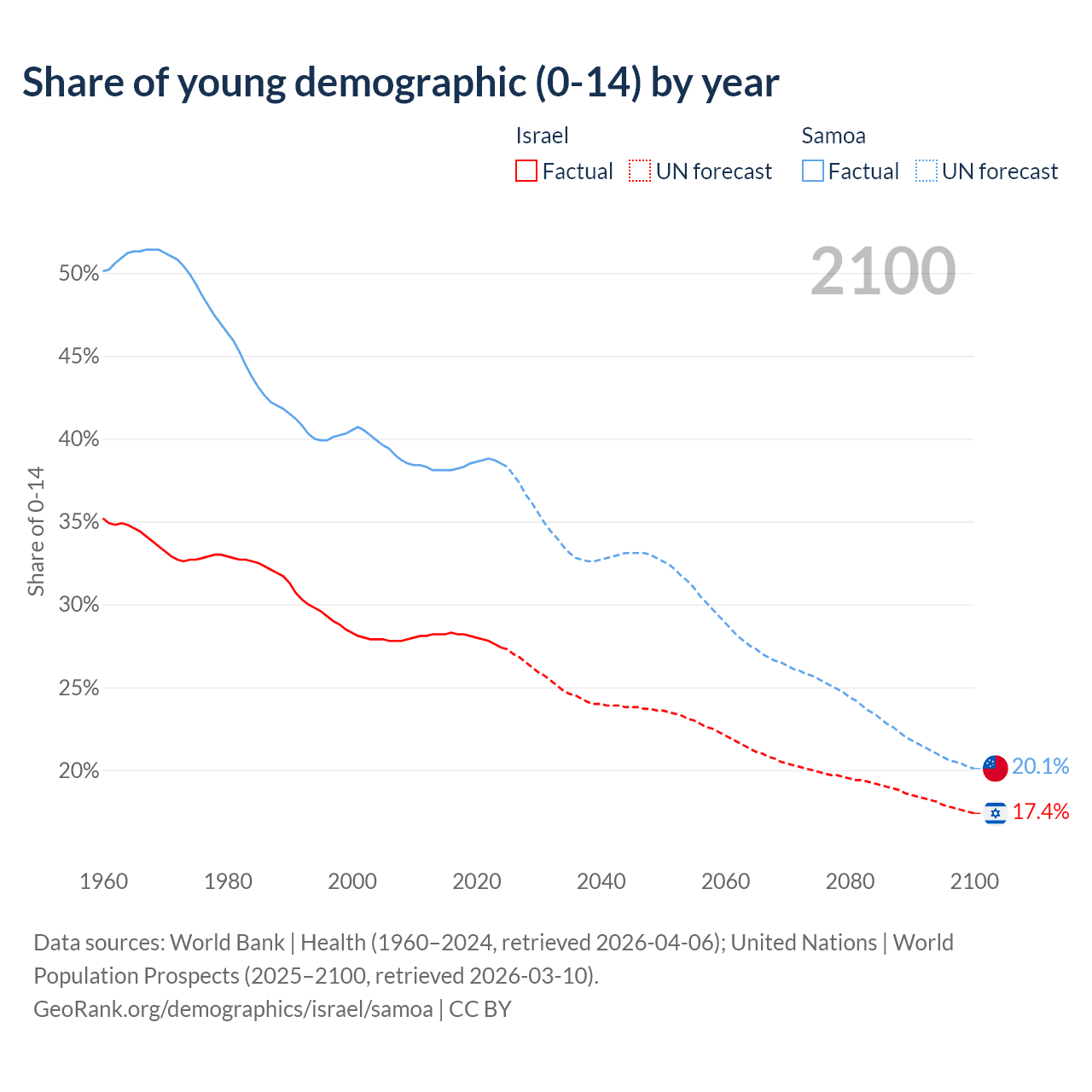 - The share of young demographic (0-15 years old) in Israel is 27.4% vs 38.5% in Samoa.