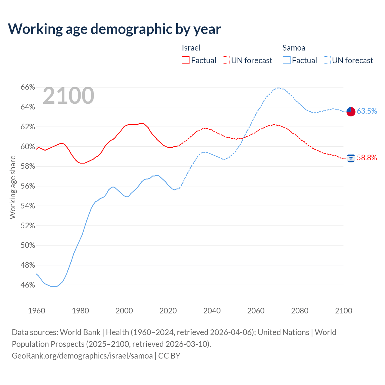 - Israel has 6.18M working age adults (aged 15-64) vs 123K in Samoa.