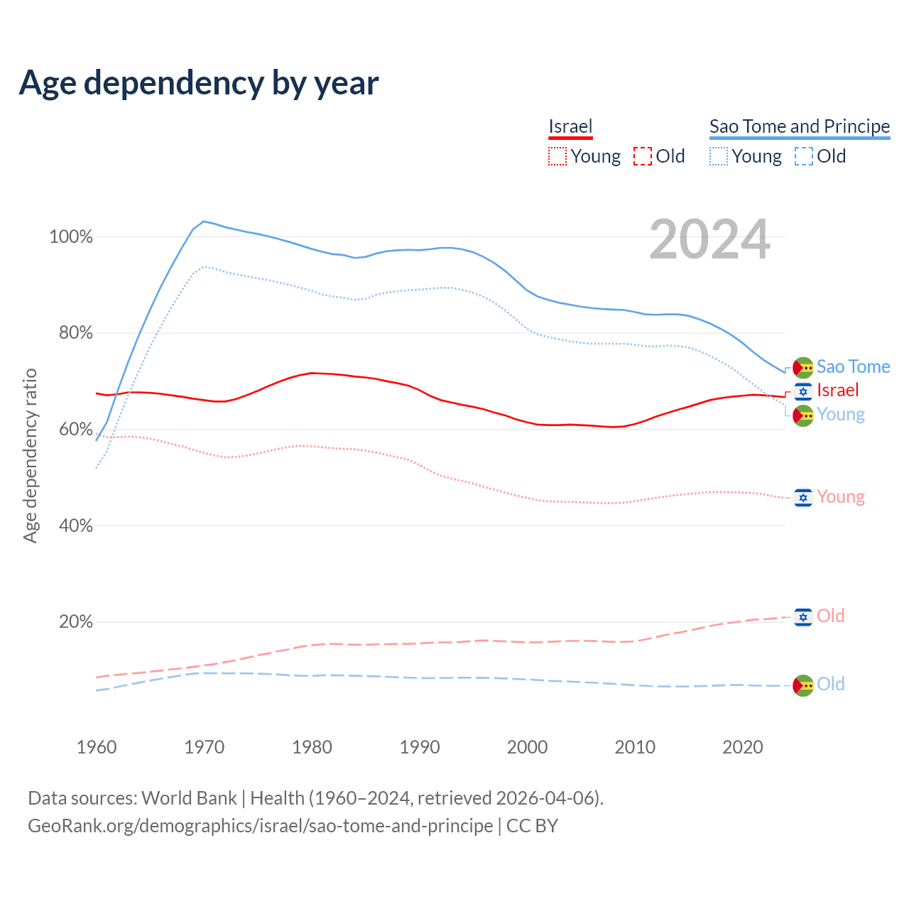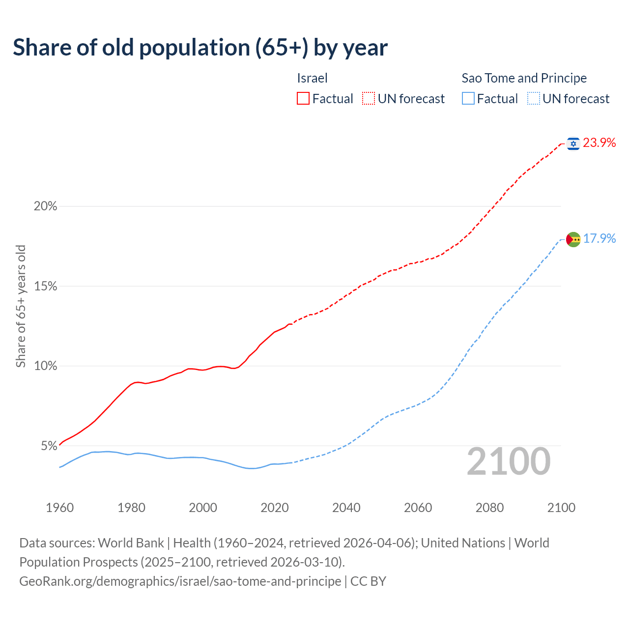 The share of older people aged 65 and over is 12.6% in Israel and 3.9% in Sao Tome and Principe. Life expectancy in Israel compared to Sao Tome and Principe .