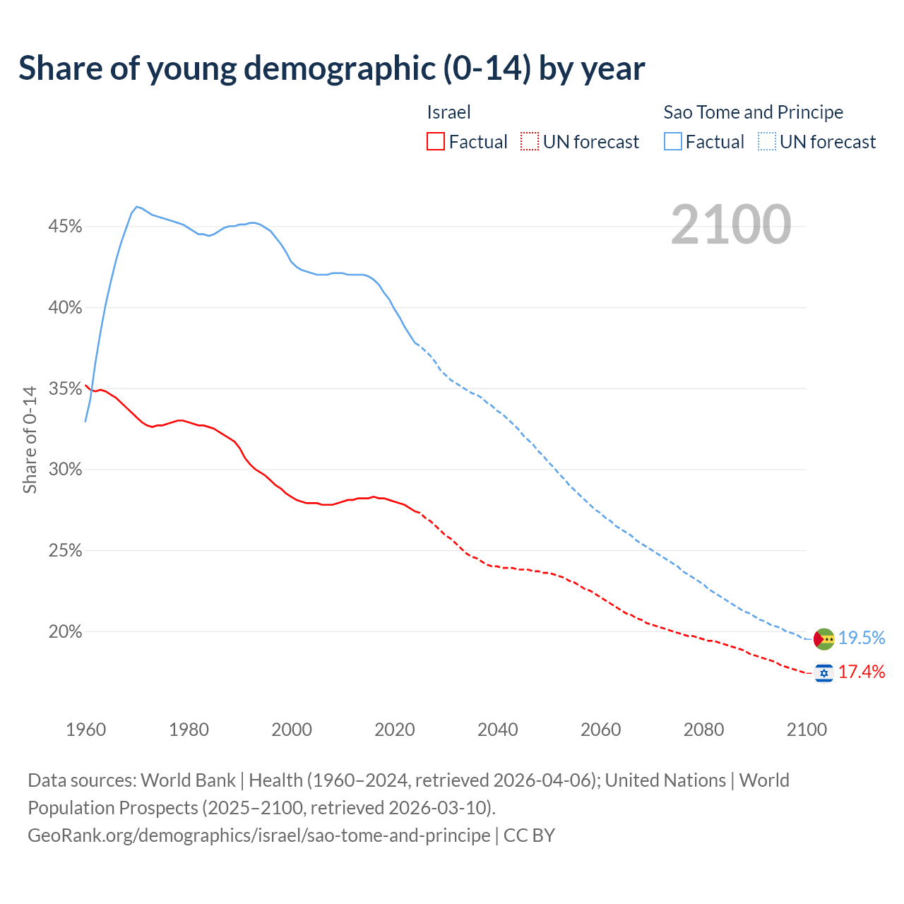 - The share of young demographic (0-15 years old) in Israel is 27.4% vs 37.8% in Sao Tome and Principe.