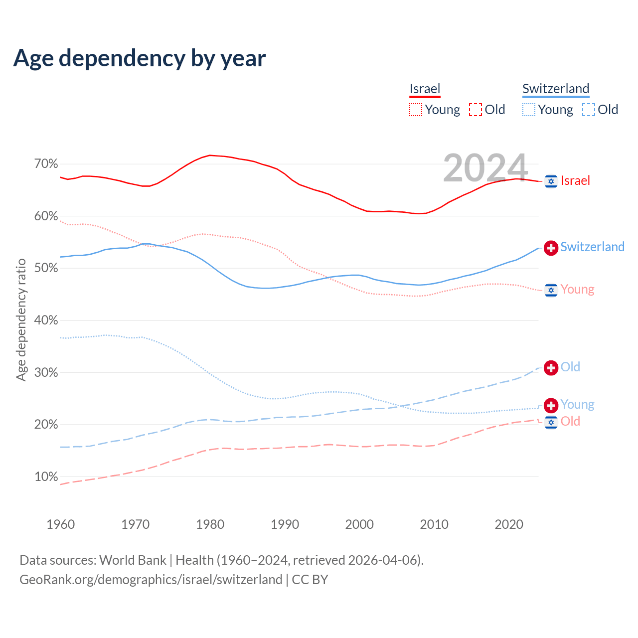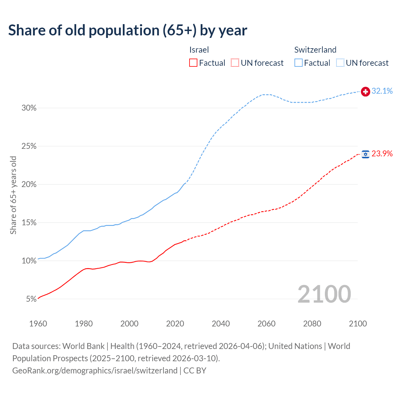 The share of older people aged 65 and over is 12.6% in Israel and 20% in Switzerland. Life expectancy in Israel compared to Switzerland .