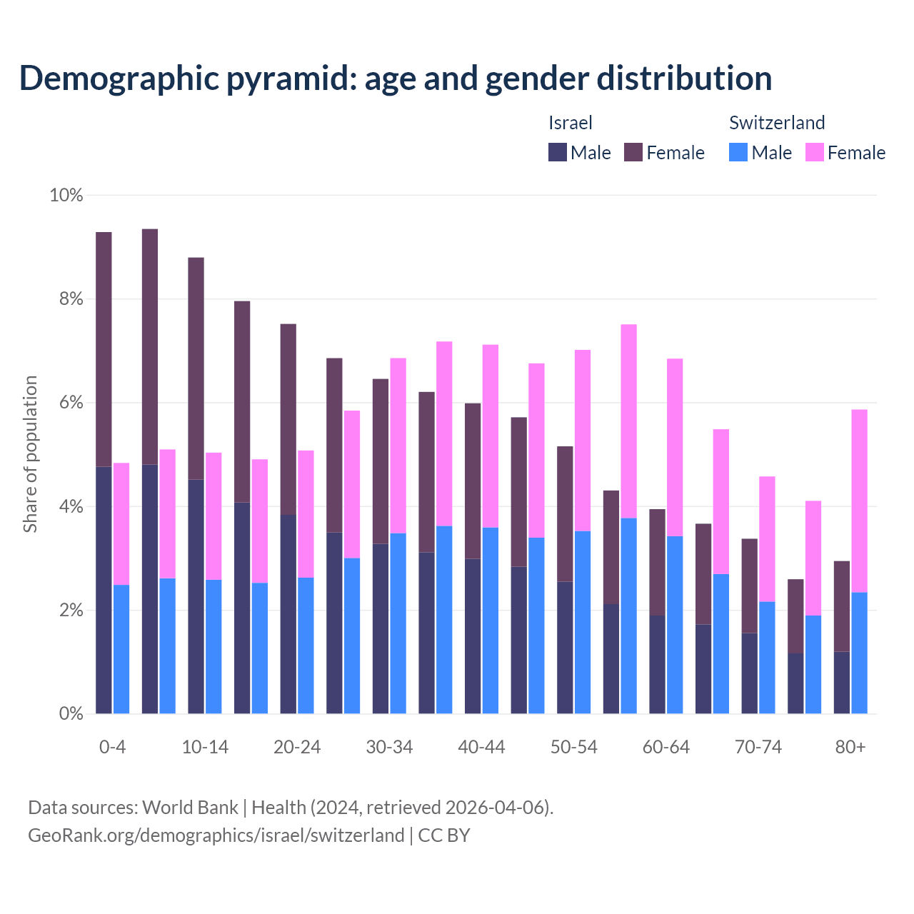 - As of 2026, the population of Israel is 10.3M vs 9.11M in Switzerland.