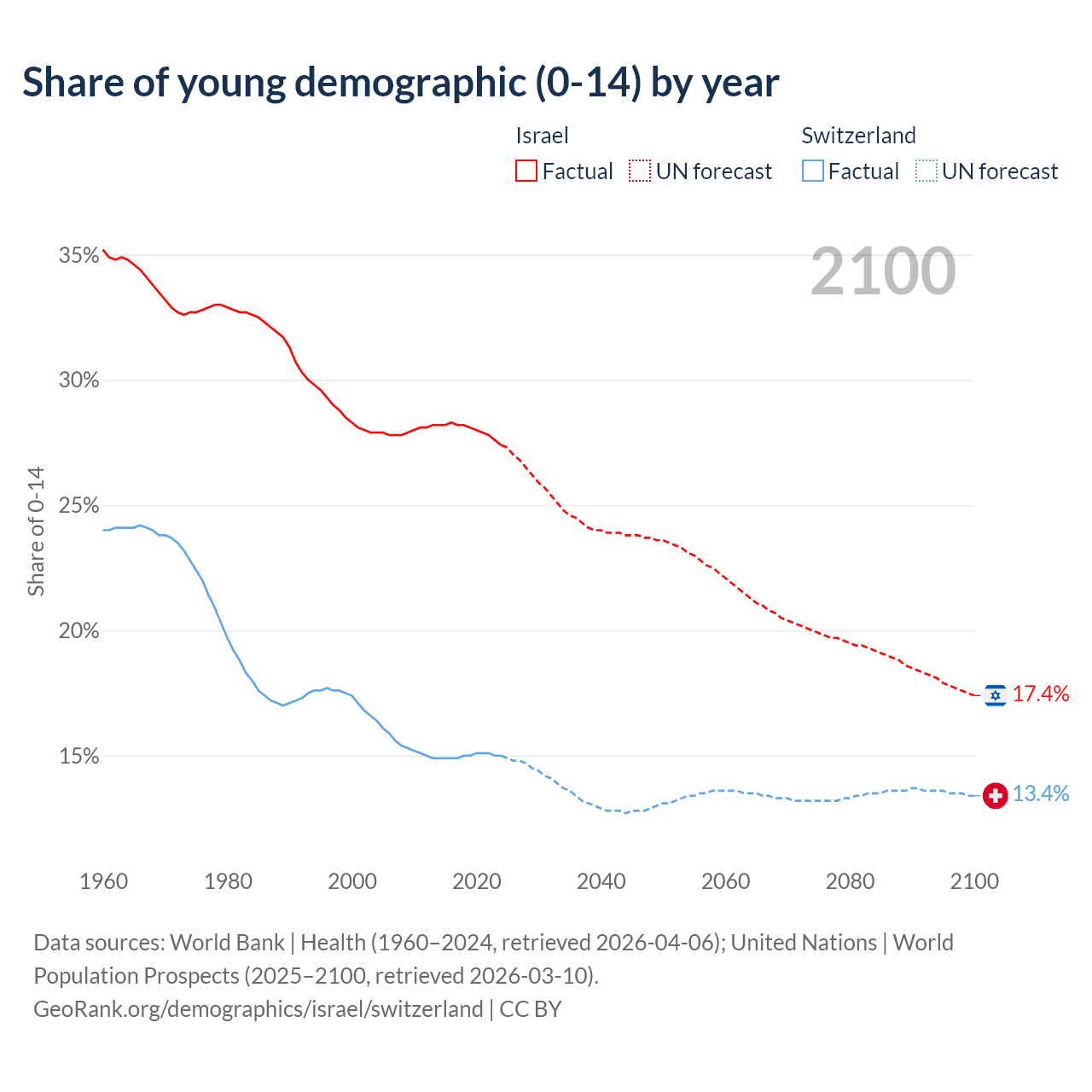 - The share of young demographic (0-15 years old) in Israel is 27.4% vs 15% in Switzerland.