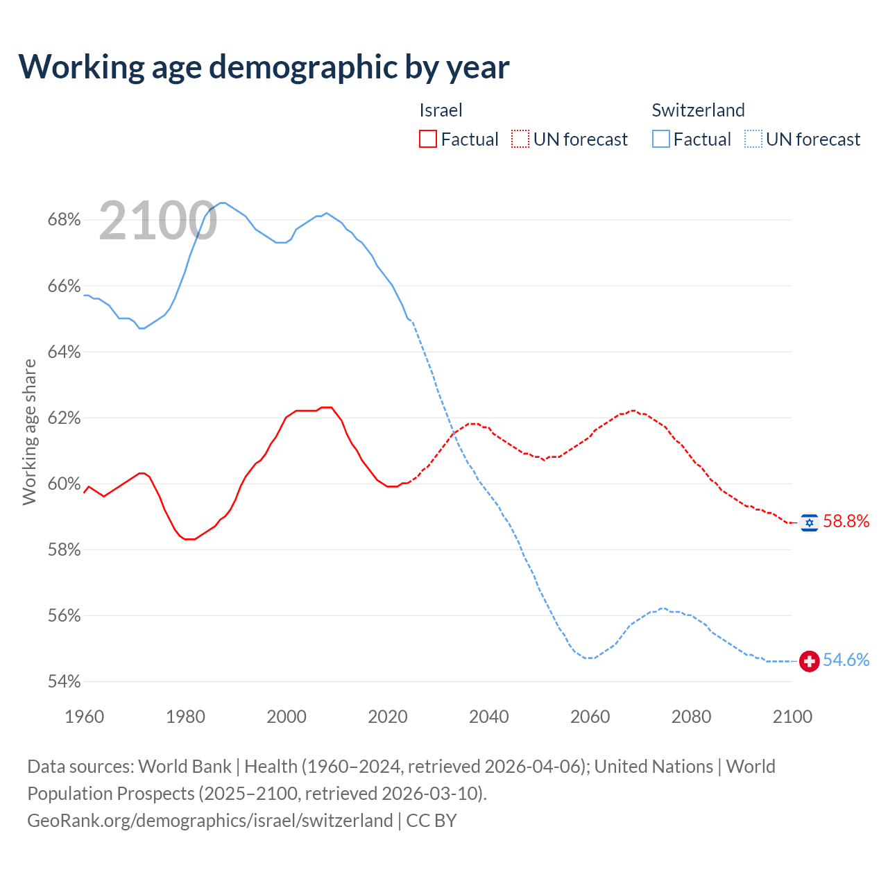 - Israel has 6.18M working age adults (aged 15-64) vs 5.92M in Switzerland.