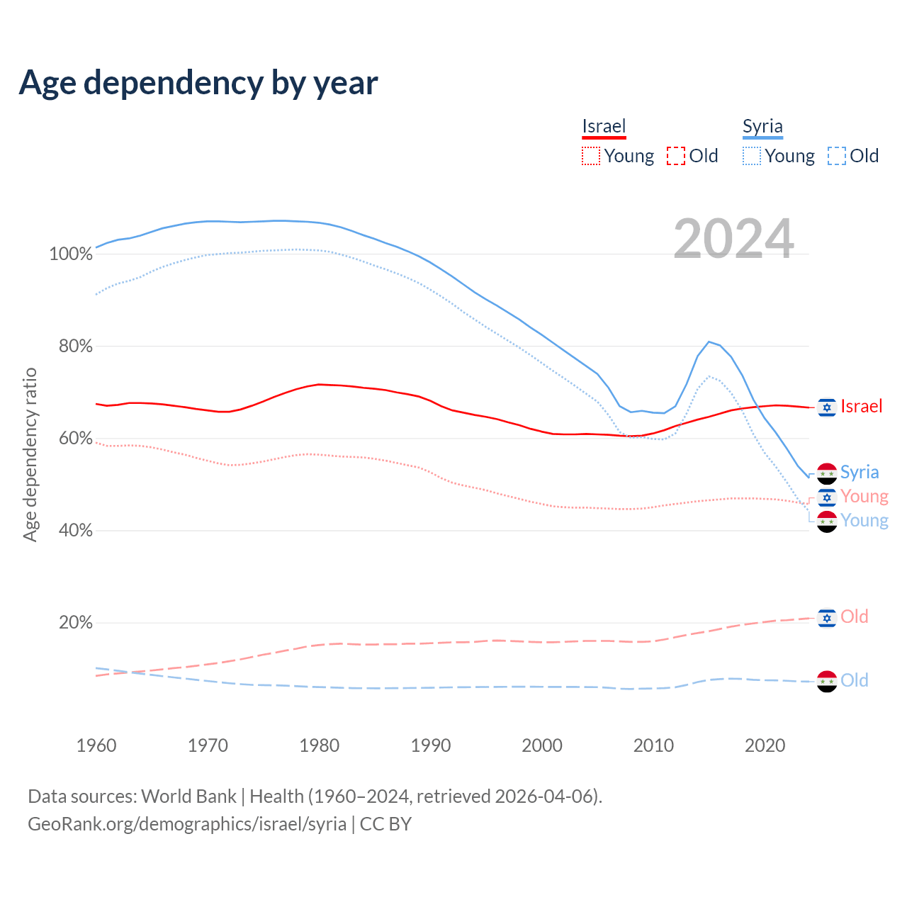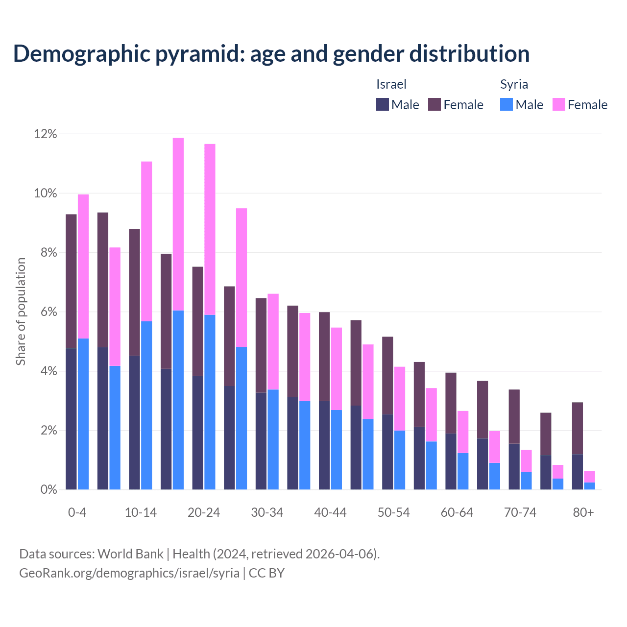 - Israel is ranked 103/196 by median age (oldest to youngest) vs 138/196 for Syria.