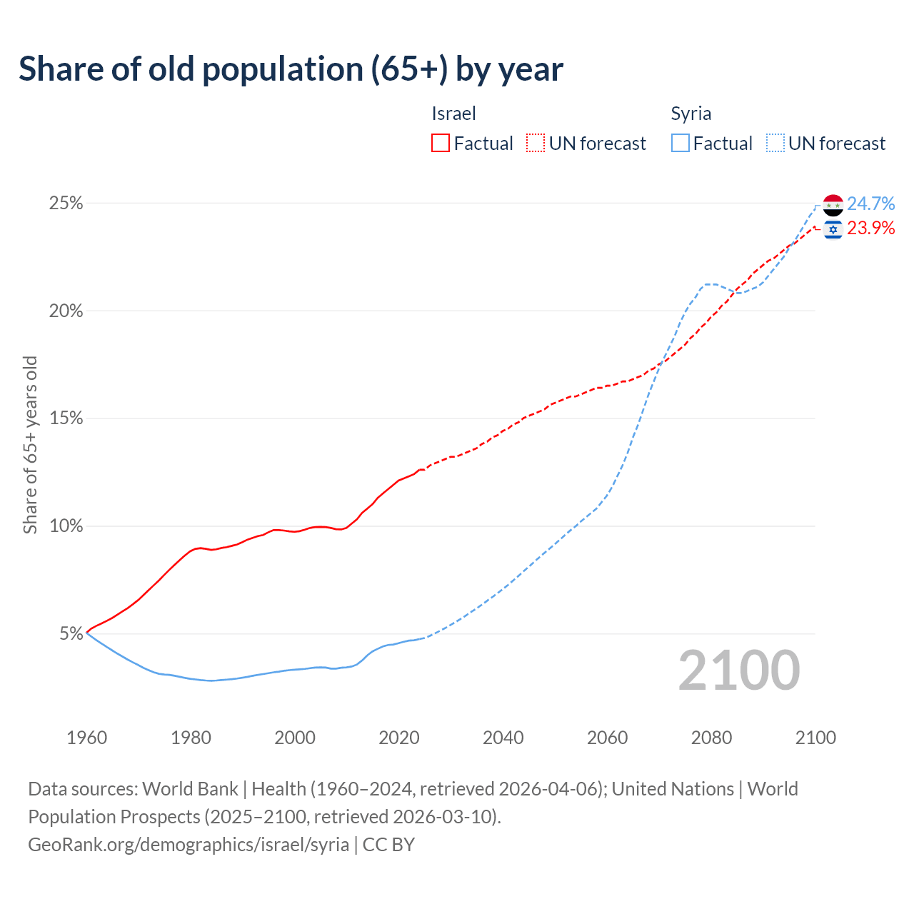 The share of older people aged 65 and over is 12.6% in Israel and 4.74% in Syria. Life expectancy in Israel compared to Syria .