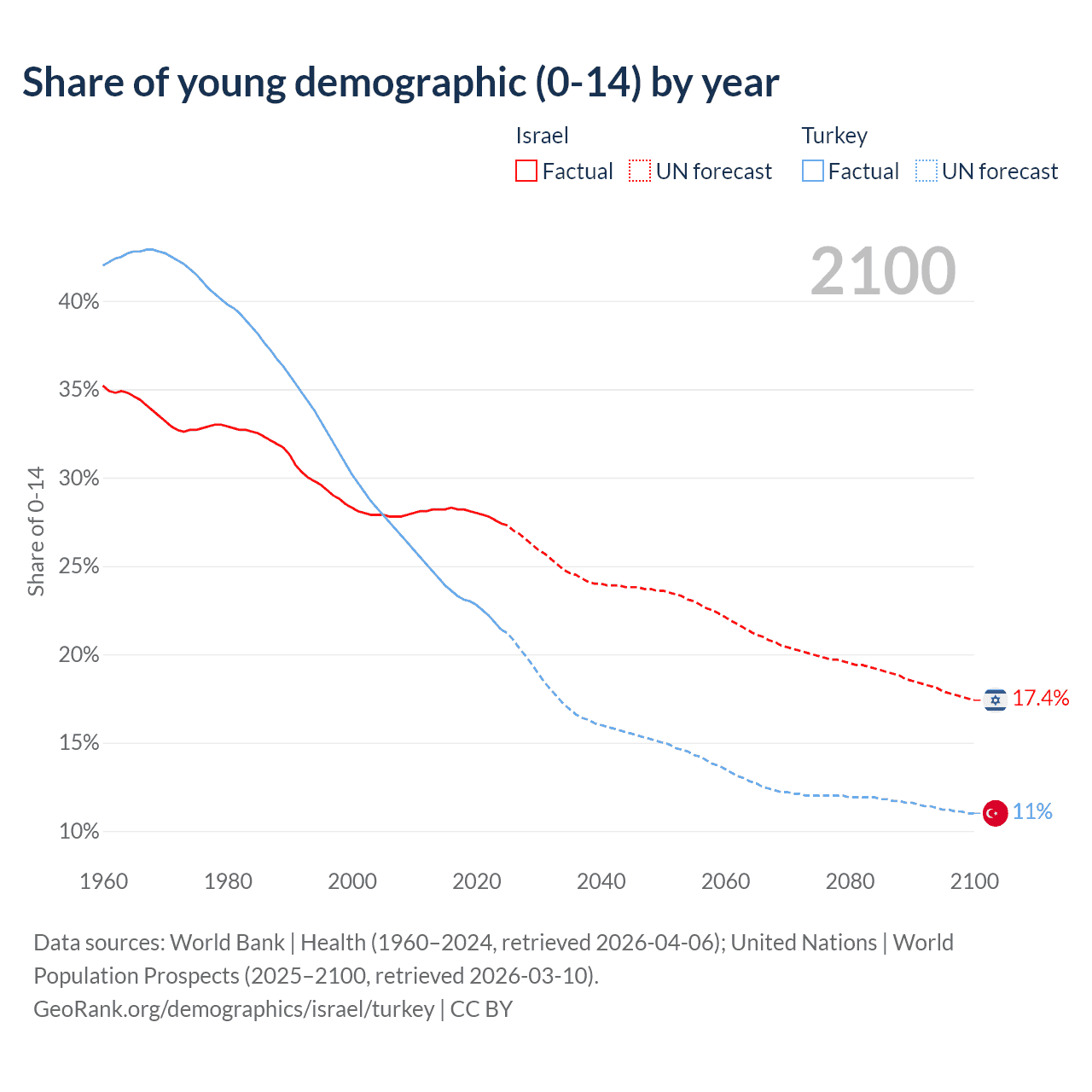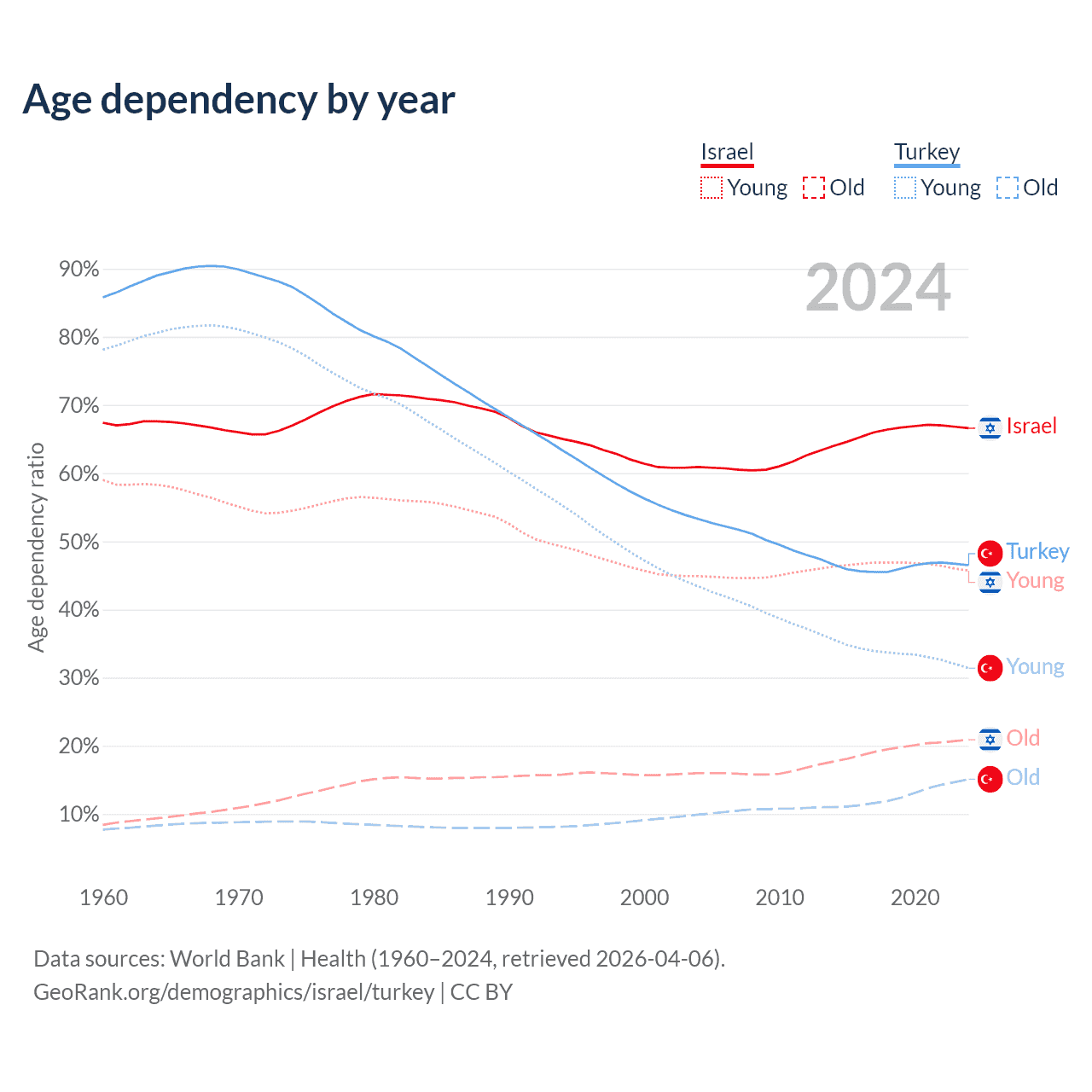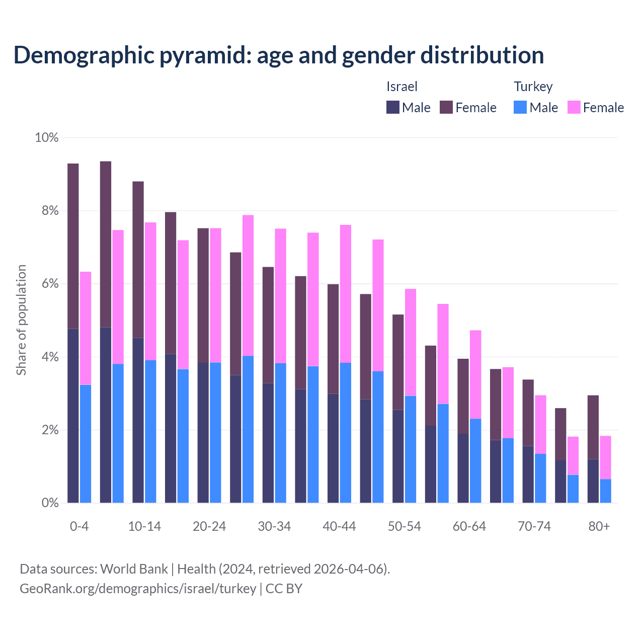 - Israel is ranked 103/196 by median age (oldest to youngest) vs 83/196 for Turkey.