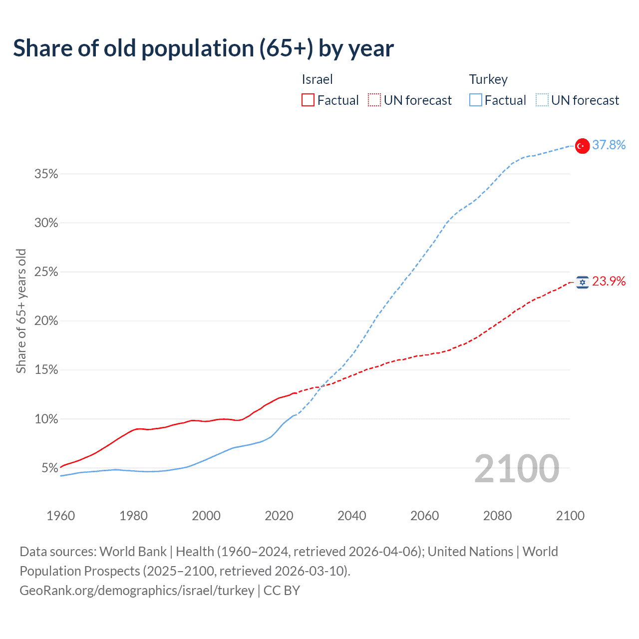 The share of older people aged 65 and over is 12.6% in Israel and 10.3% in Turkey. Life expectancy in Israel compared to Turkey .