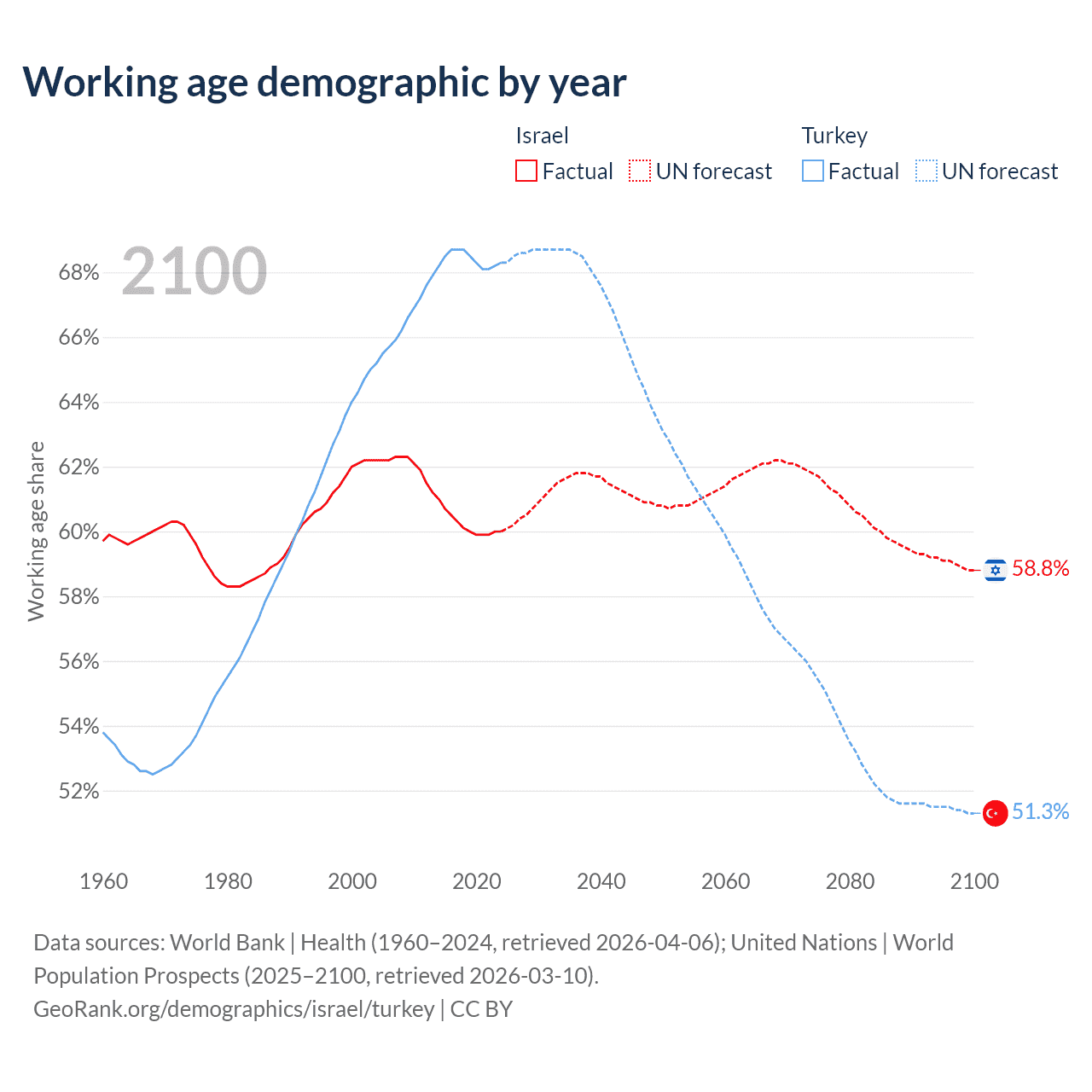 - Israel has 6.18M working age adults (aged 15-64) vs 58.7M in Turkey.