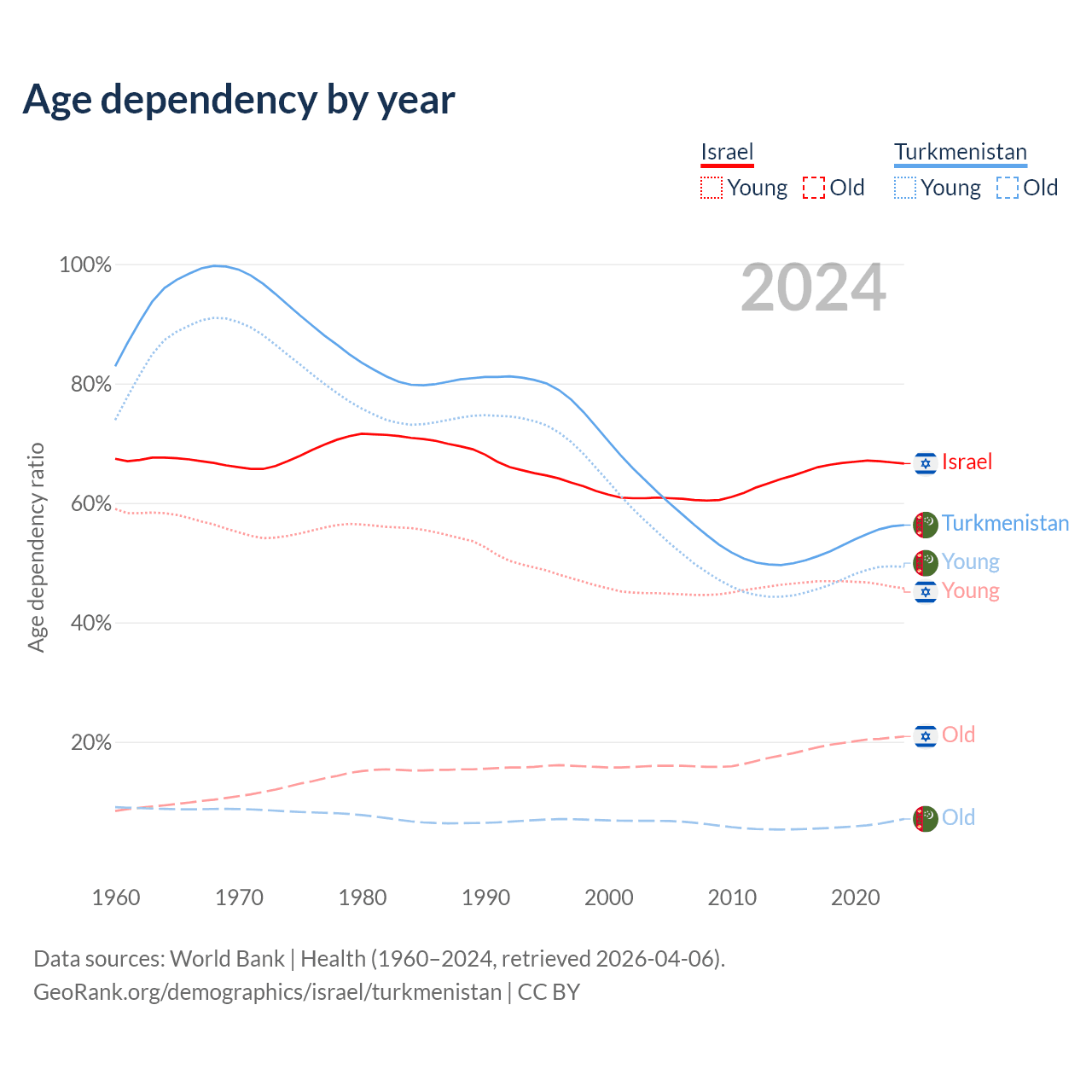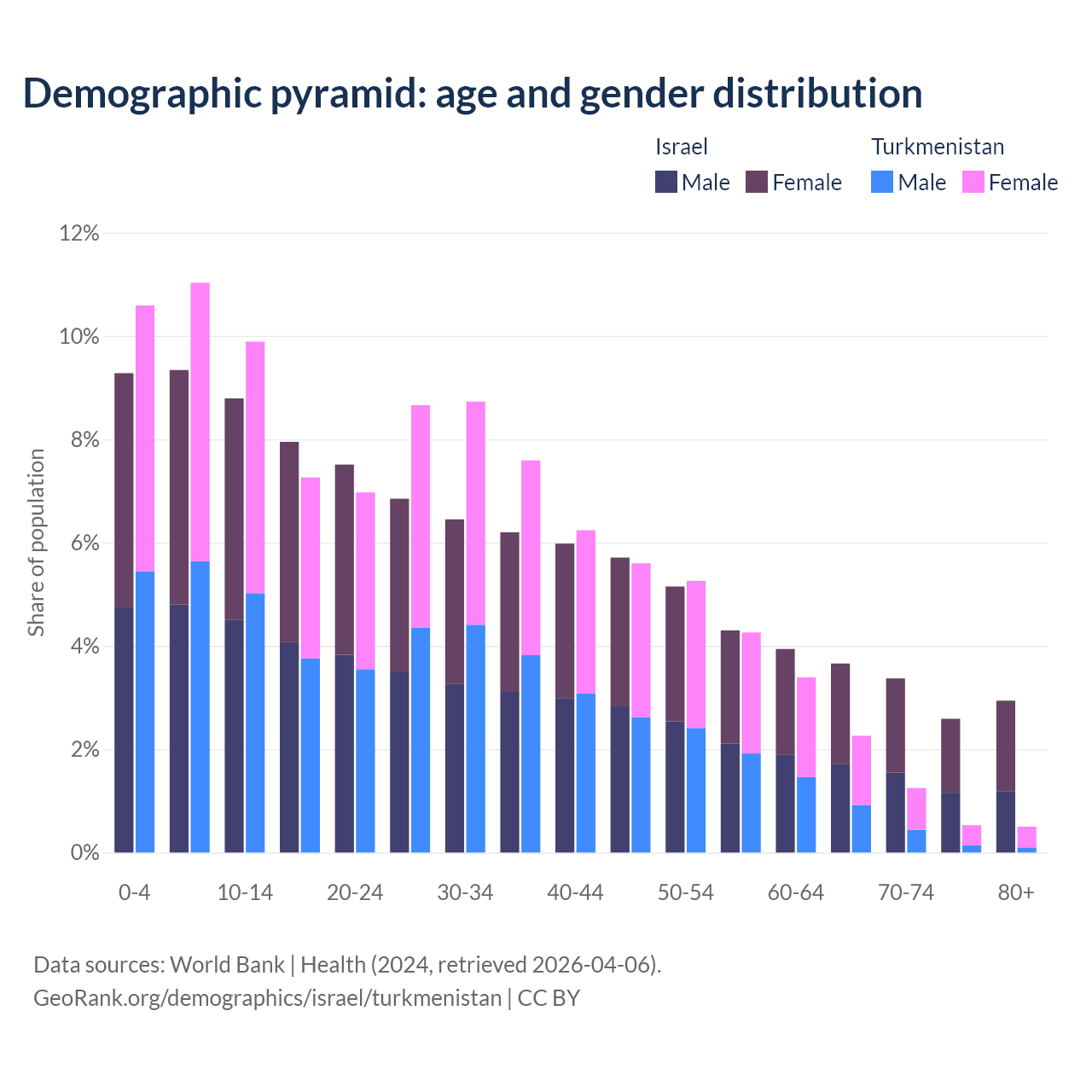 - Israel is ranked 103/196 by median age (oldest to youngest) vs 119/196 for Turkmenistan.